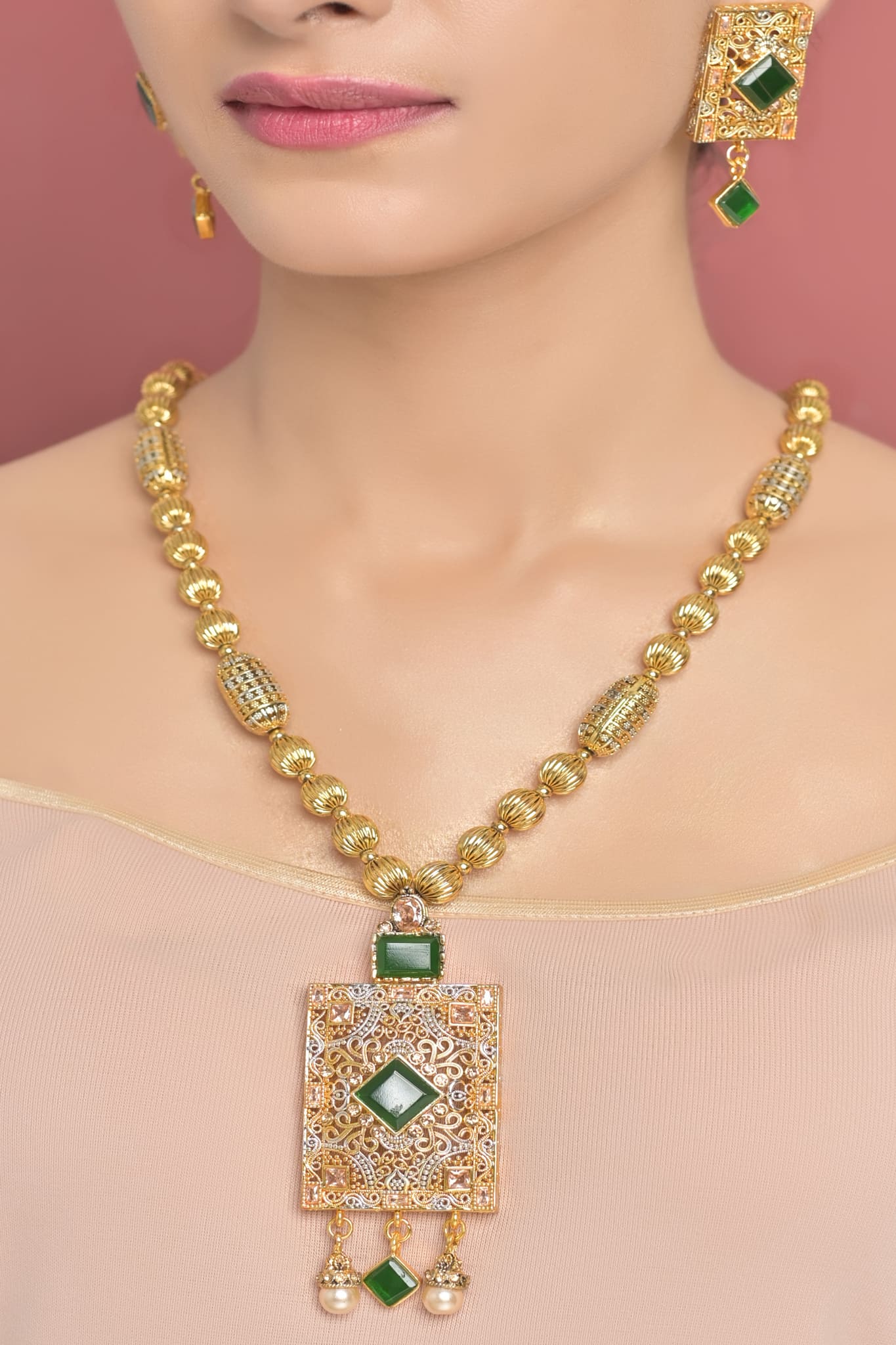 GOLDEN AND GREEN MALA SET STANDARD SIZE MALA WITH EARRINGS MATERIAL MANJUS MADE IN PAKISTAN KEEP AWAY FROM WATER, PERFUME...