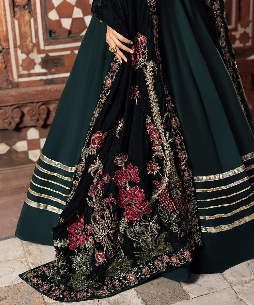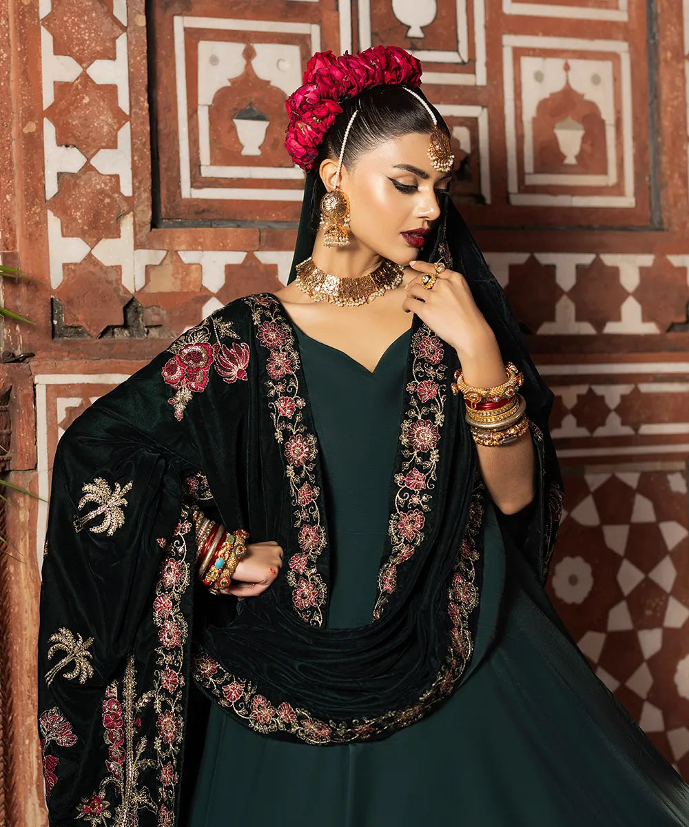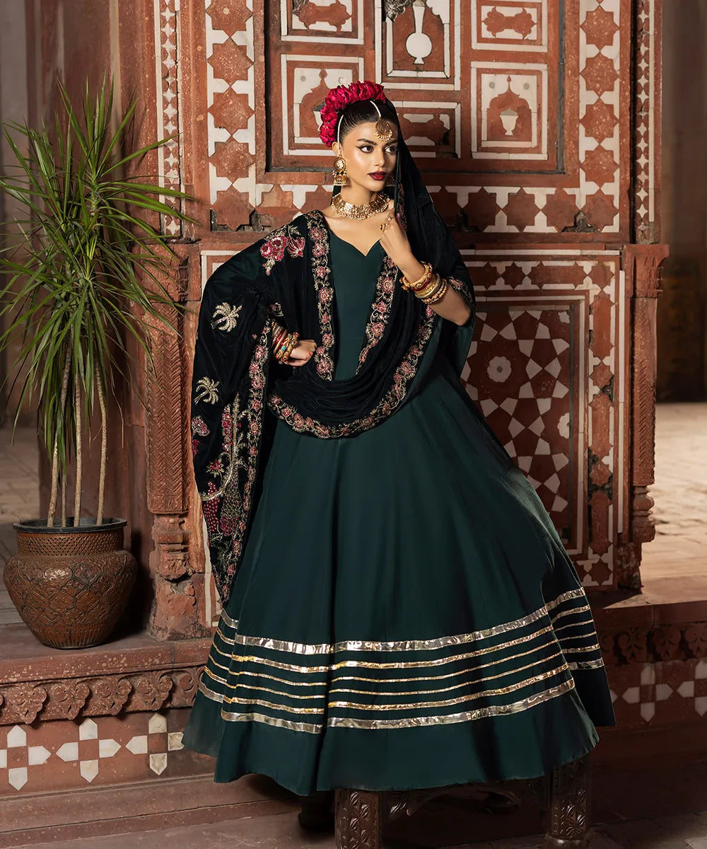 An emerald green pishwas in raw silk has a sweetheart neckline and gold lappa finishings on the border.