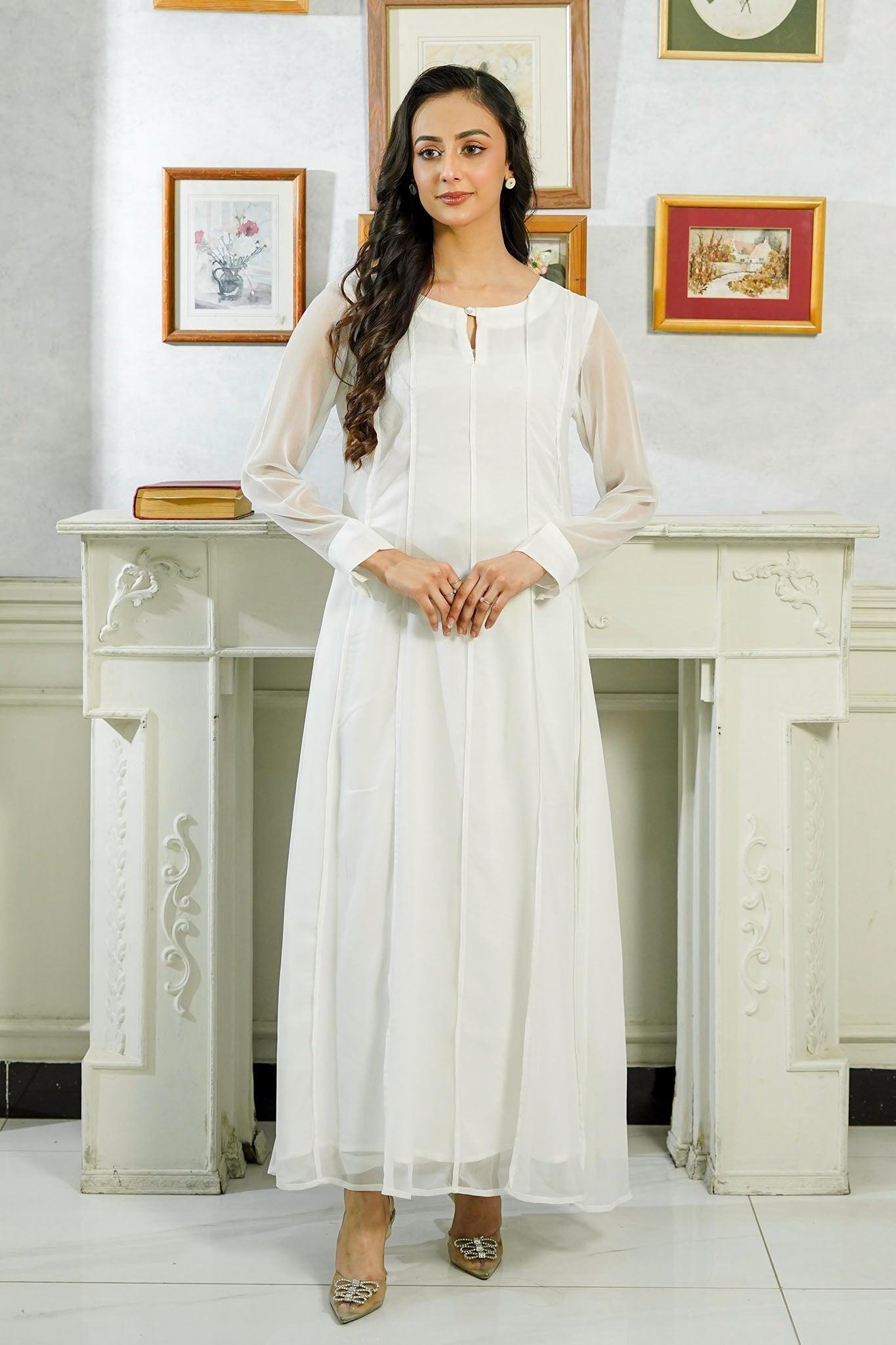 Embrace timeless charm with the Pearl Whisper Frock, designed with soft flowing fabric and graceful long sleeves. The subtle pleated details on the bodice add structure, while the keyhole neckline offers a touch of modern style.