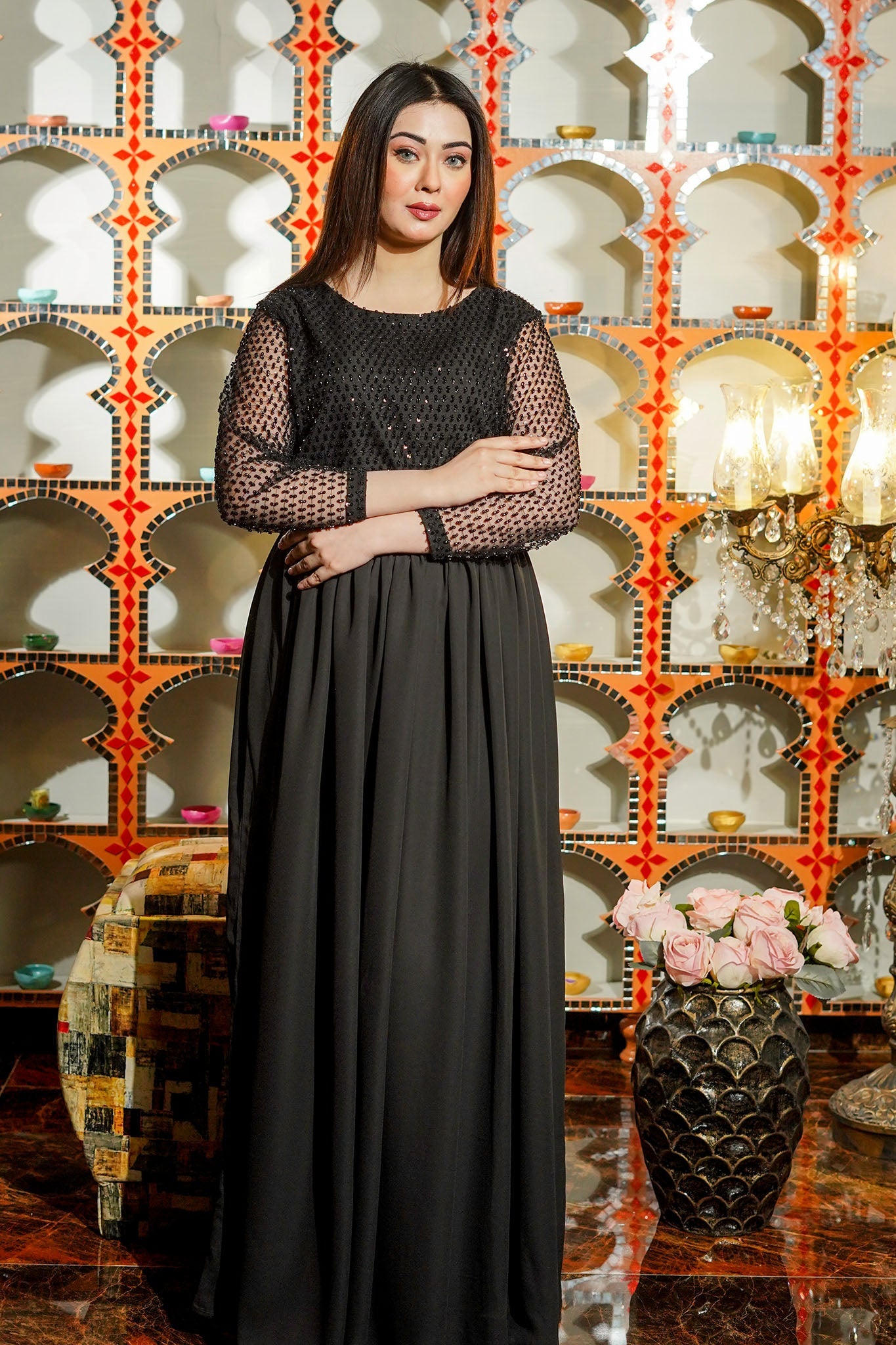 This elegant full-length maxi dress features a stunning combination of luxurious fabrics and intricate details. The upper body is crafted with a semi-sheer net adorned with delicate beadwork, offering a sophisticated sparkle. The lower portion is made of flowing georgette fabric, ensuring graceful movement and a flattering silhouette.