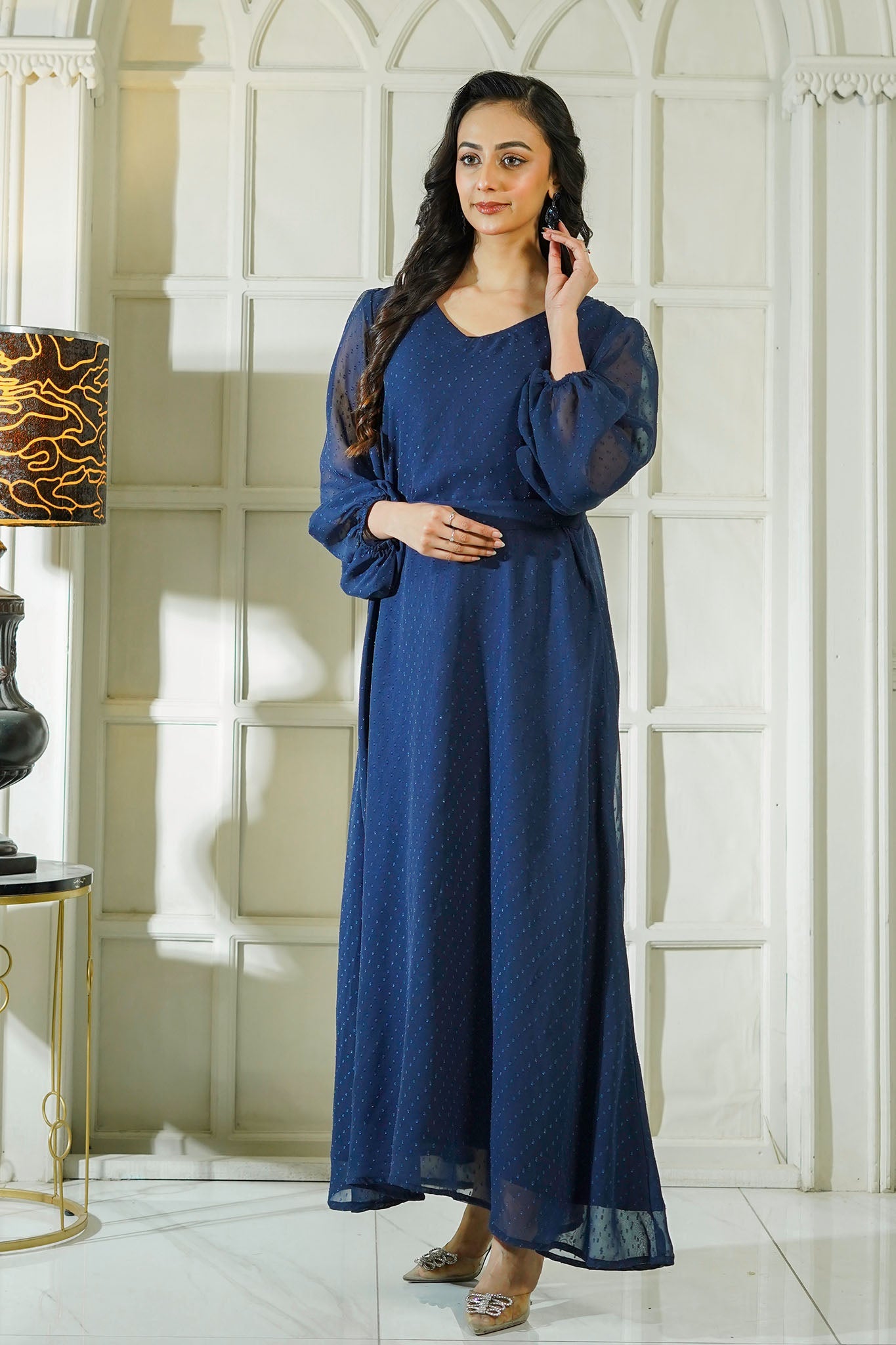 This is a navy blue chiffon maxi , characterized by its lightweight fabric .The design includes a soft V-neckline, full-length puffed sleeves with elasticized cuffs, enhanced with a charming bow tie detail at the back The dress has a flowy silhouette, making it suitable for formal or semi-formal occasions.