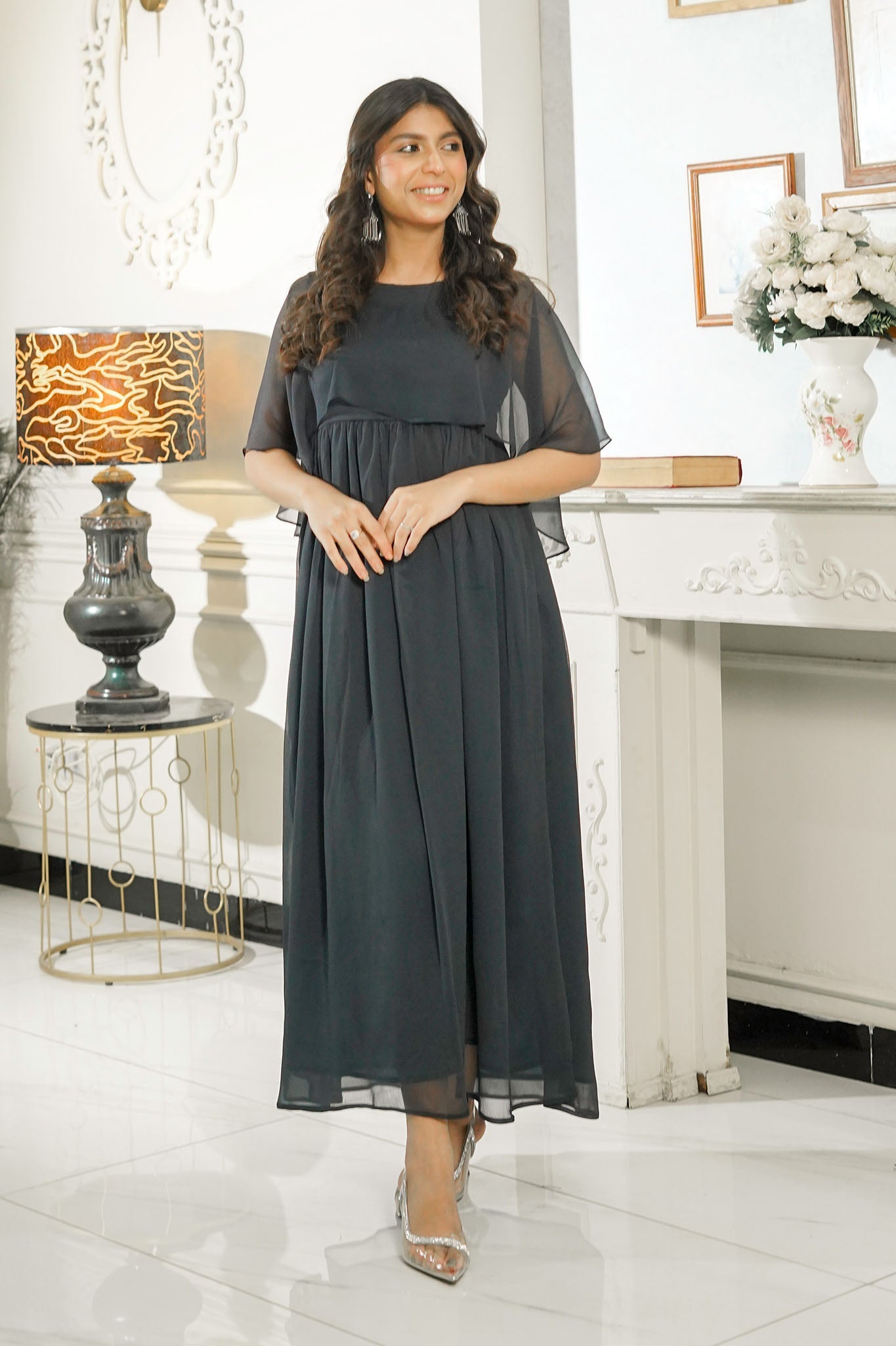 Upgrade your wardrobe with this beautifully designed Grey midi dress that exudes elegance and versatility. This stunning piece features a flared silhouette, giving it a modern and flattering shape. The sleeveless design and soft chiffon fabric offer both comfort and grace, making it perfect for any occasion.