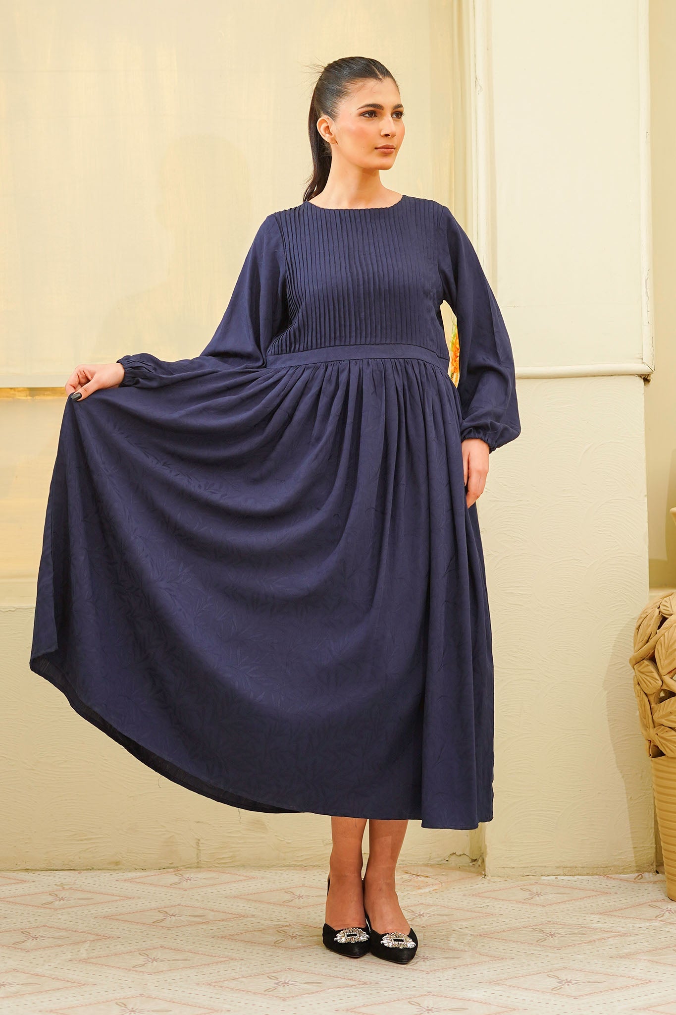 Step into timeless elegance with this exquisite midnight blue maxi dress. The finely pleated bodice creates a symphony of texture and grace, while the self-pleated fabric adds a subtle yet striking depth to the design. With its long, flowing silhouette and billowing full-length sleeves, this dress brings a perfect blend of sophistication and comfort. The cinched waistline flatters your figure, making it a must-have for dreamy evening soirées