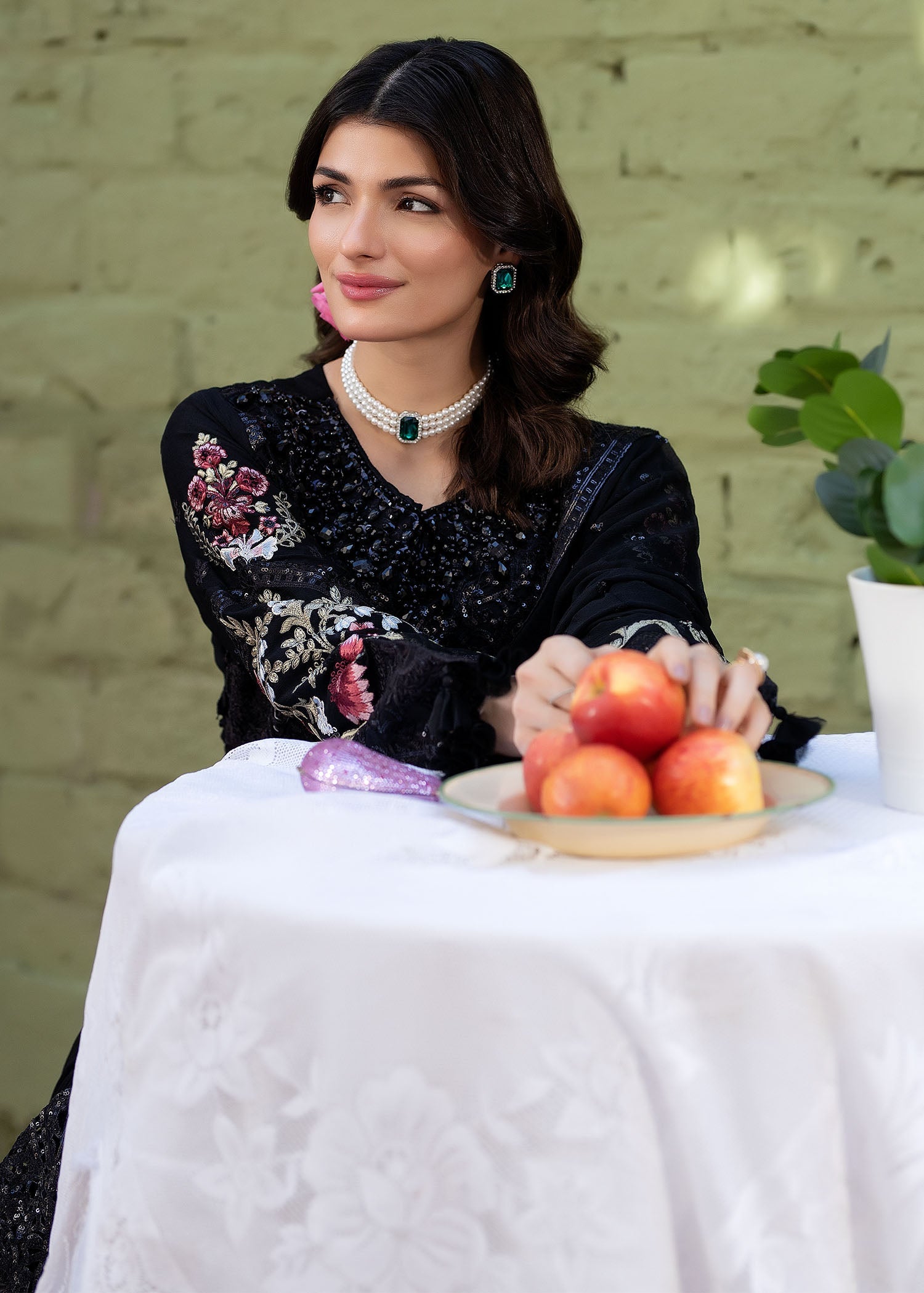 A stunning black maxi showcasing intricate laser cutwork with delicate adda detailing along the neckline. Embroidered organza borders enhance the hem and sleeves, complemented by embroidered chiffon sleeves and back. Paired with straight raw silk trousers for an effortlessly elegant look.