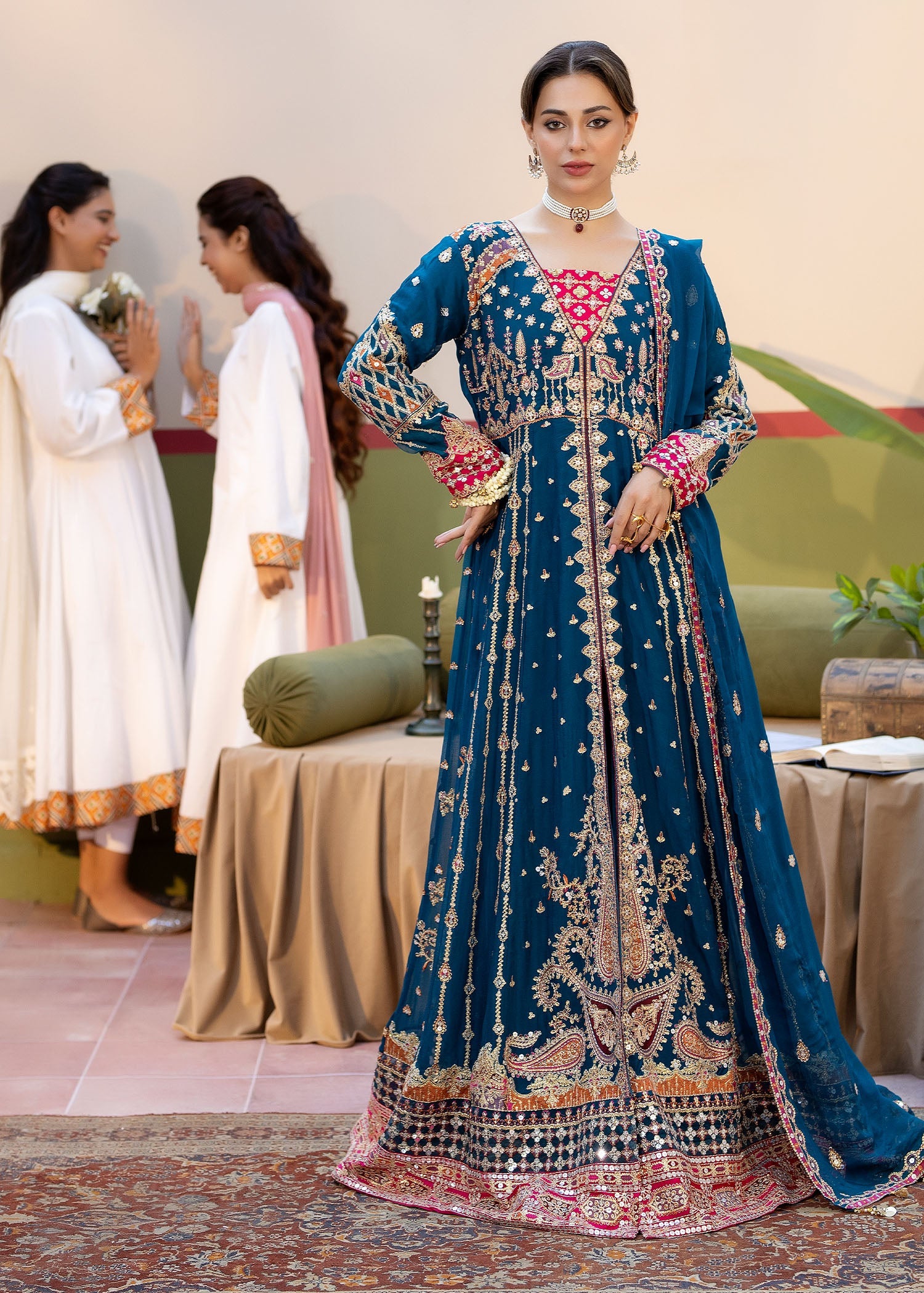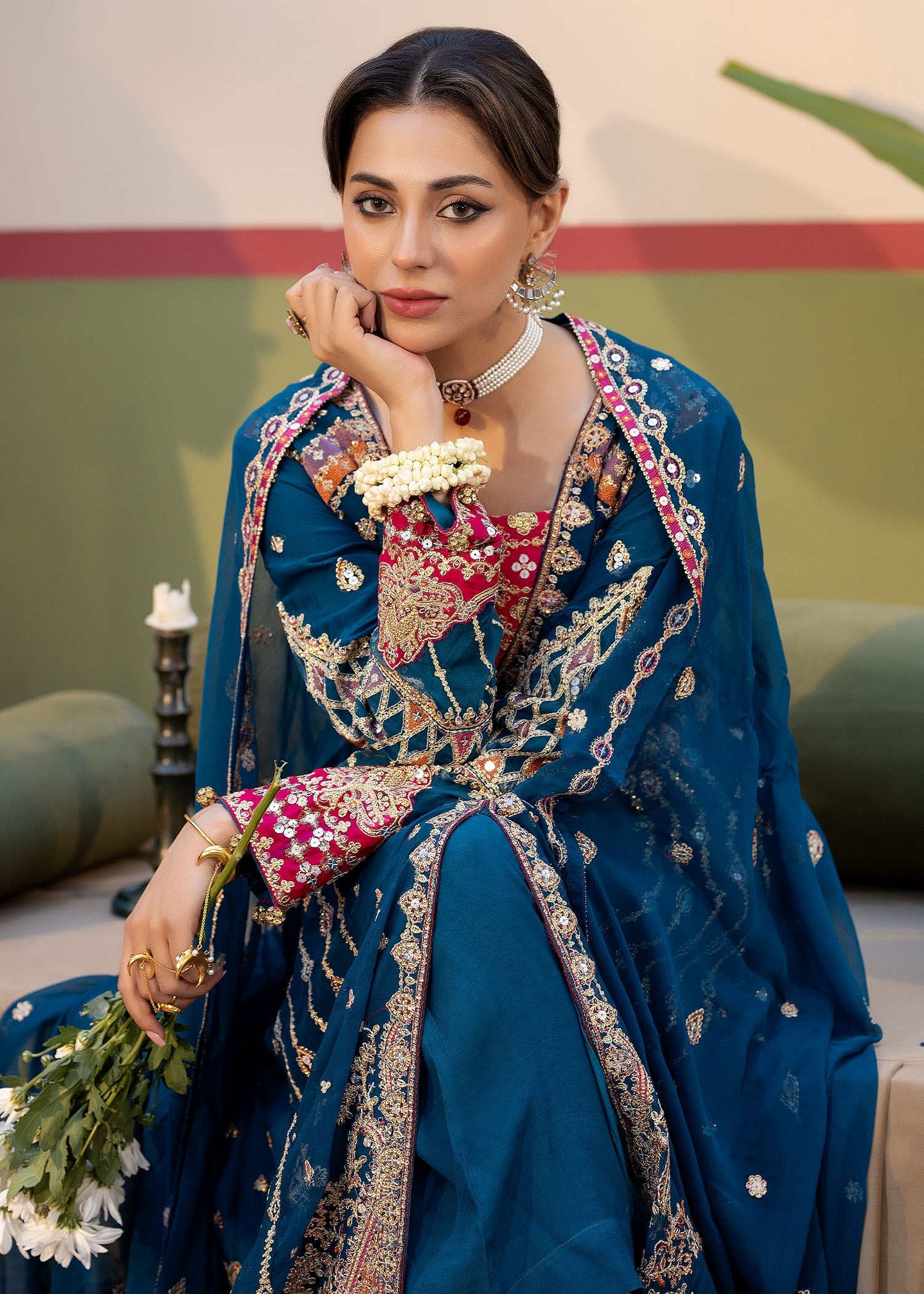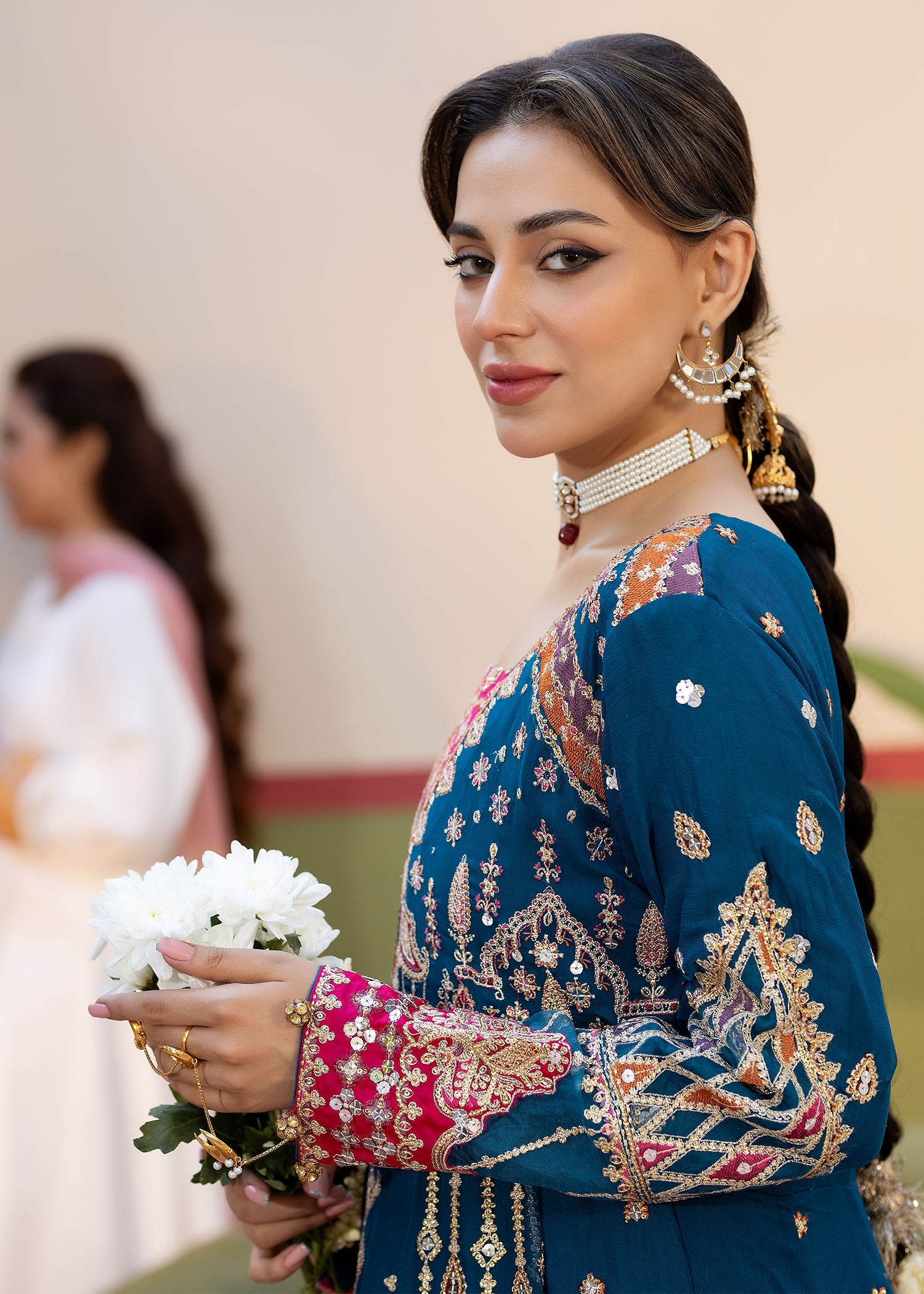 Teal dreams crafted in chiffon — a straight-cut embroidered maxi detailed with intricate patterns and silk borders, paired with an embroidered chiffon dupatta and a raw silk trouser for a graceful, timeless finish.