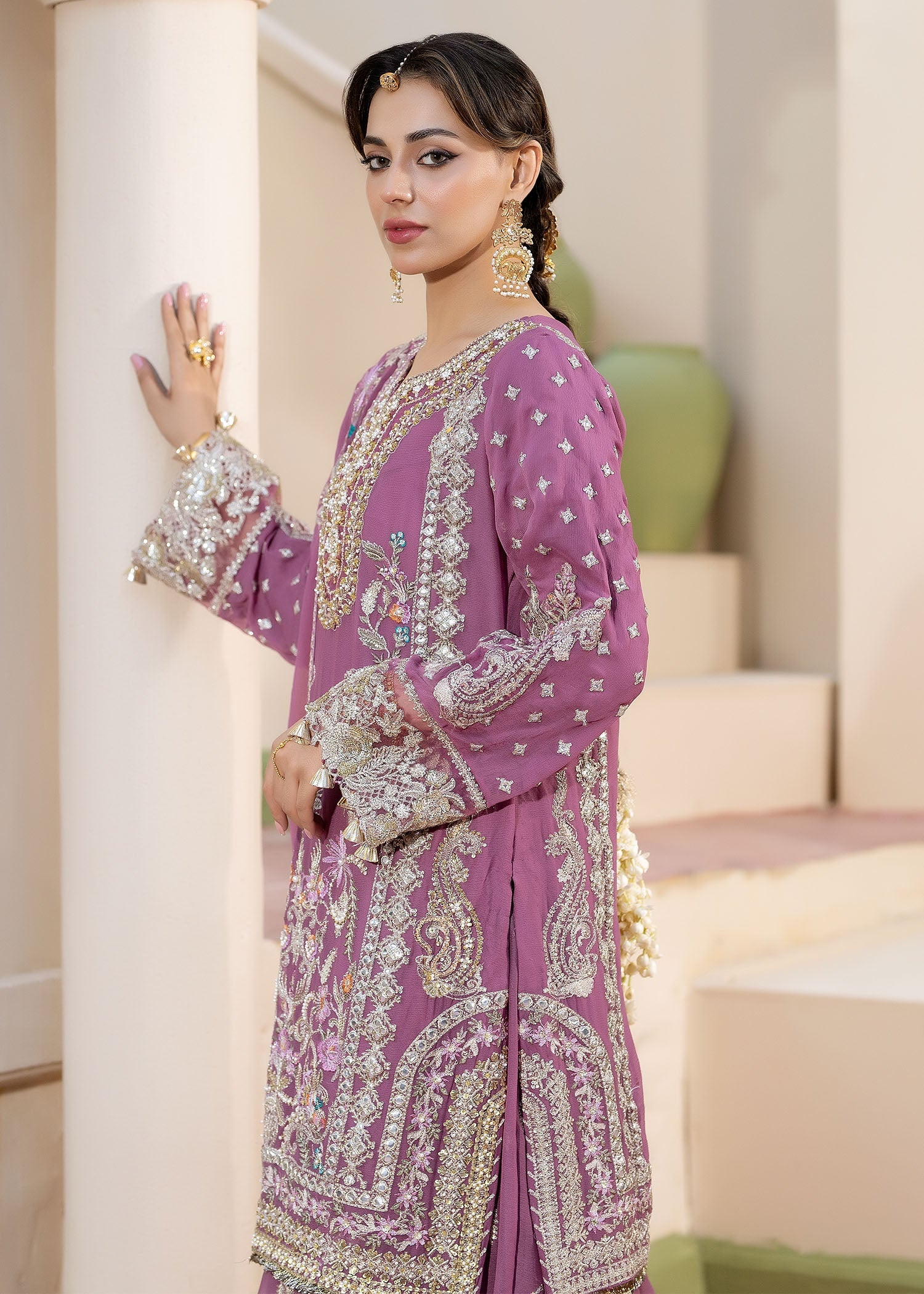 Draped in charm, this embroidered chiffon shirt showcases delicate hand-embellished adda work on the neckline. The embroidered chiffon sleeves exude grace, paired with a finely embroidered chiffon dupatta. Finished with an embroidered chiffon sharara adorned with an embroidered silk border for a luxurious, classic look.