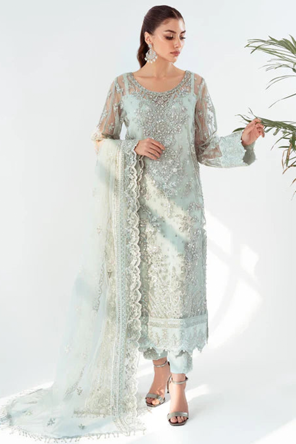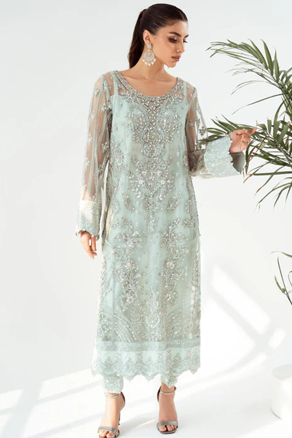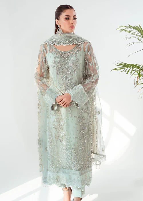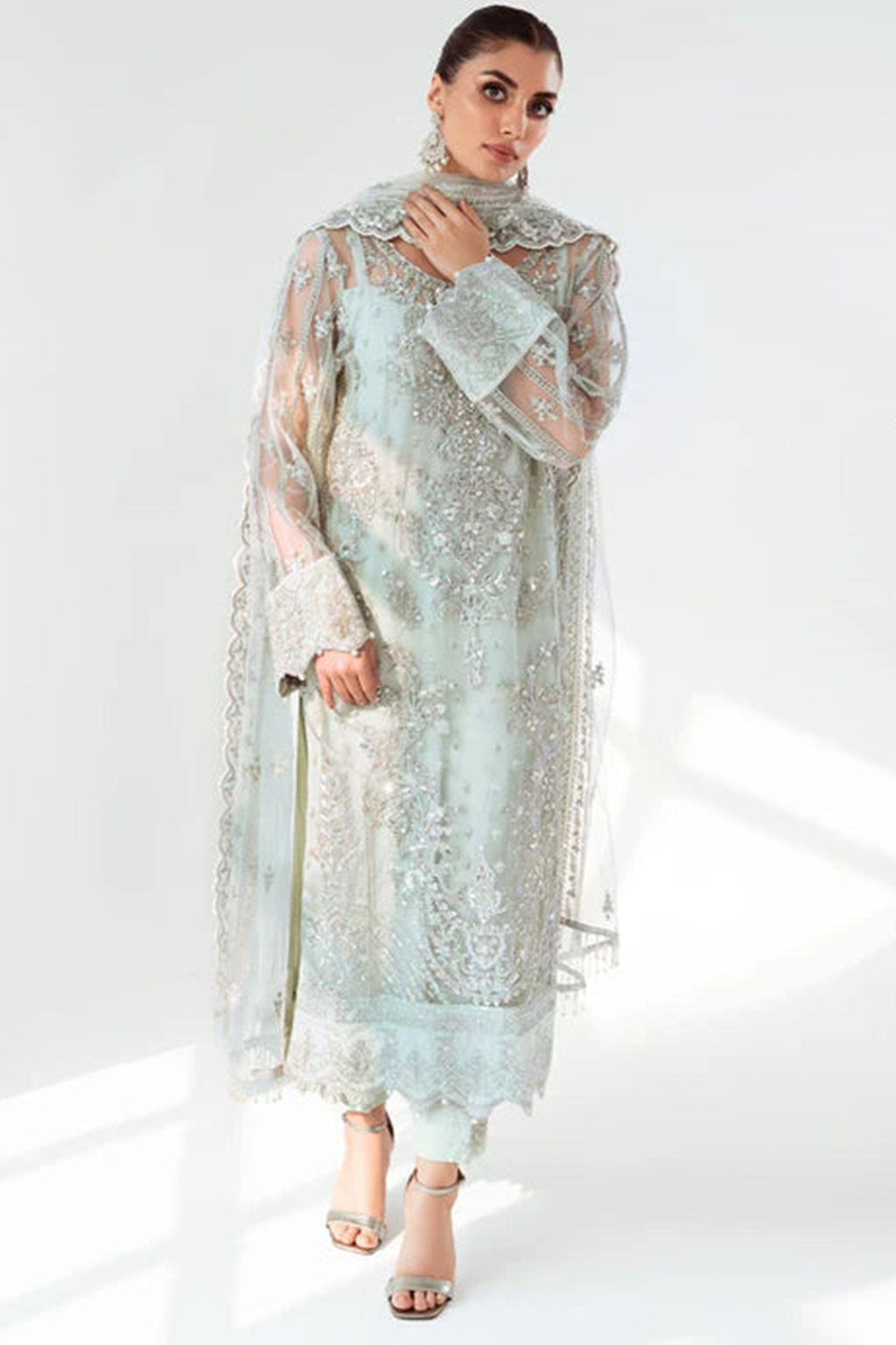 Additional Description:Hand Embellished Front On Net 0.66 Meter Embroidered Back Side Extensions On Net 1.32 Meter Embroidered Sleeves On Net 0.66 Meter Embroidered Sleeves Border On Raw Silk 1 meter Embroidered Front Boder On Raw Silk 1 meter Embroidered Back Boder On Raw Silk 1 meter Embroidered Dupatta On Net 2.5 Meter Embroidered Trouser Motif On Organza 1 pair Under Shirt Cotton Silk 2.25 Meter Trouser Raw Silk 2.25 Meter