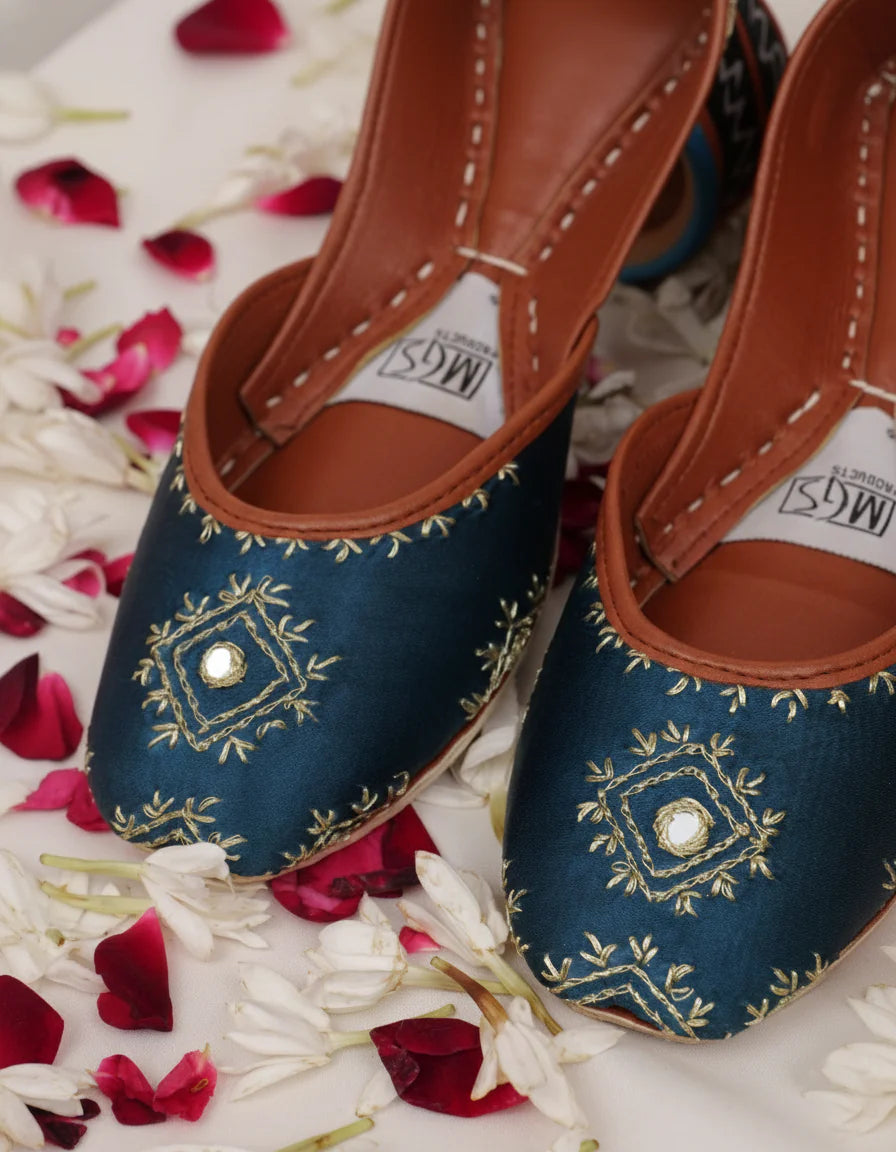 Crafted with love, this stunning peacock green khussa features intricate golden zari and mirror work, showcasing the skill and dedication of our master artisans.