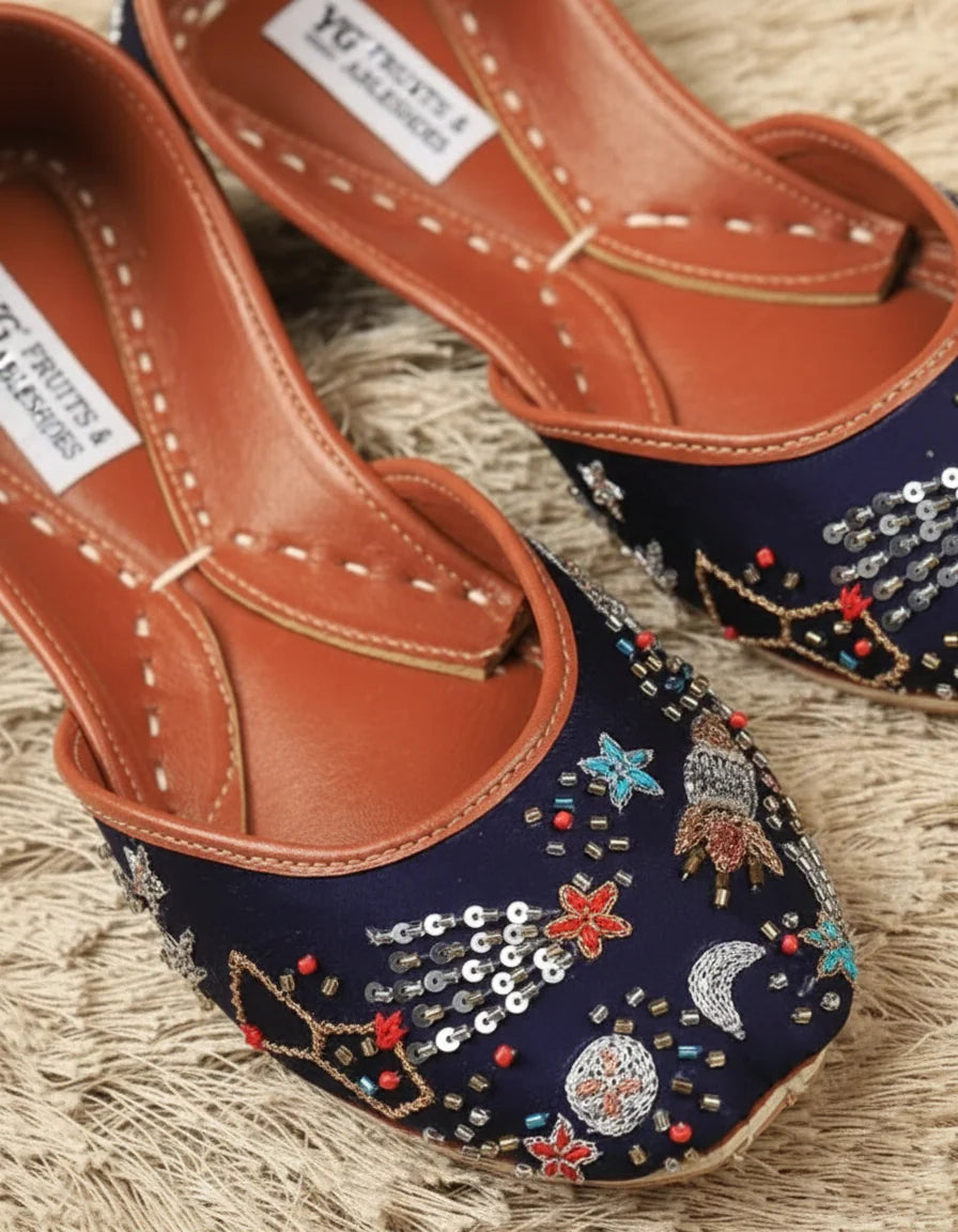 Step into the cosmos with our Galaxy Shooting Star Juttis – a perfect blend of celestial elegance and traditional craftsmanship. These handcrafted feature intricate bead and sequin embroidery inspired by shooting stars, moons, and galaxies against a deep midnight blue base. The soft leather lining and cushioned insole ensure comfort with every step, making them ideal for festive occasions or adding a magical touch to your everyday wear. Let your feet sparkle like the night sky!
