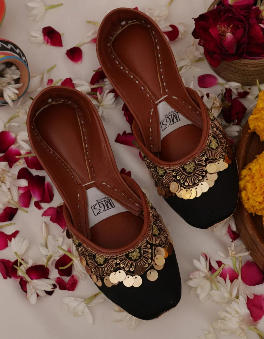 A statement black khussa adorned with elegant antique gold embroidery and shimmering sequins, finished with playful gold discs that catch the light with every step. Paired beautifully with traditional or fusion wear, these khussas promise to elevate your look effortlessly.
