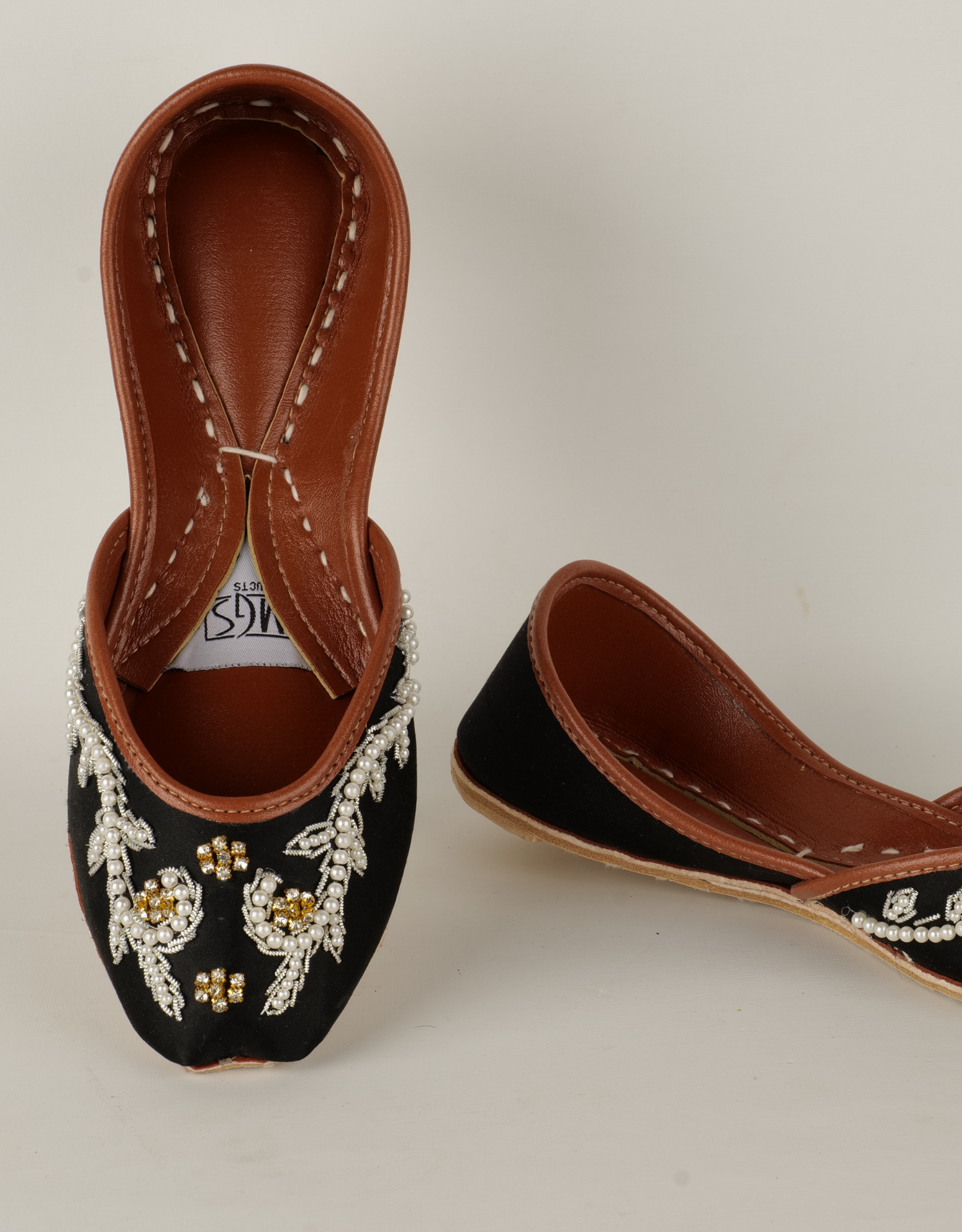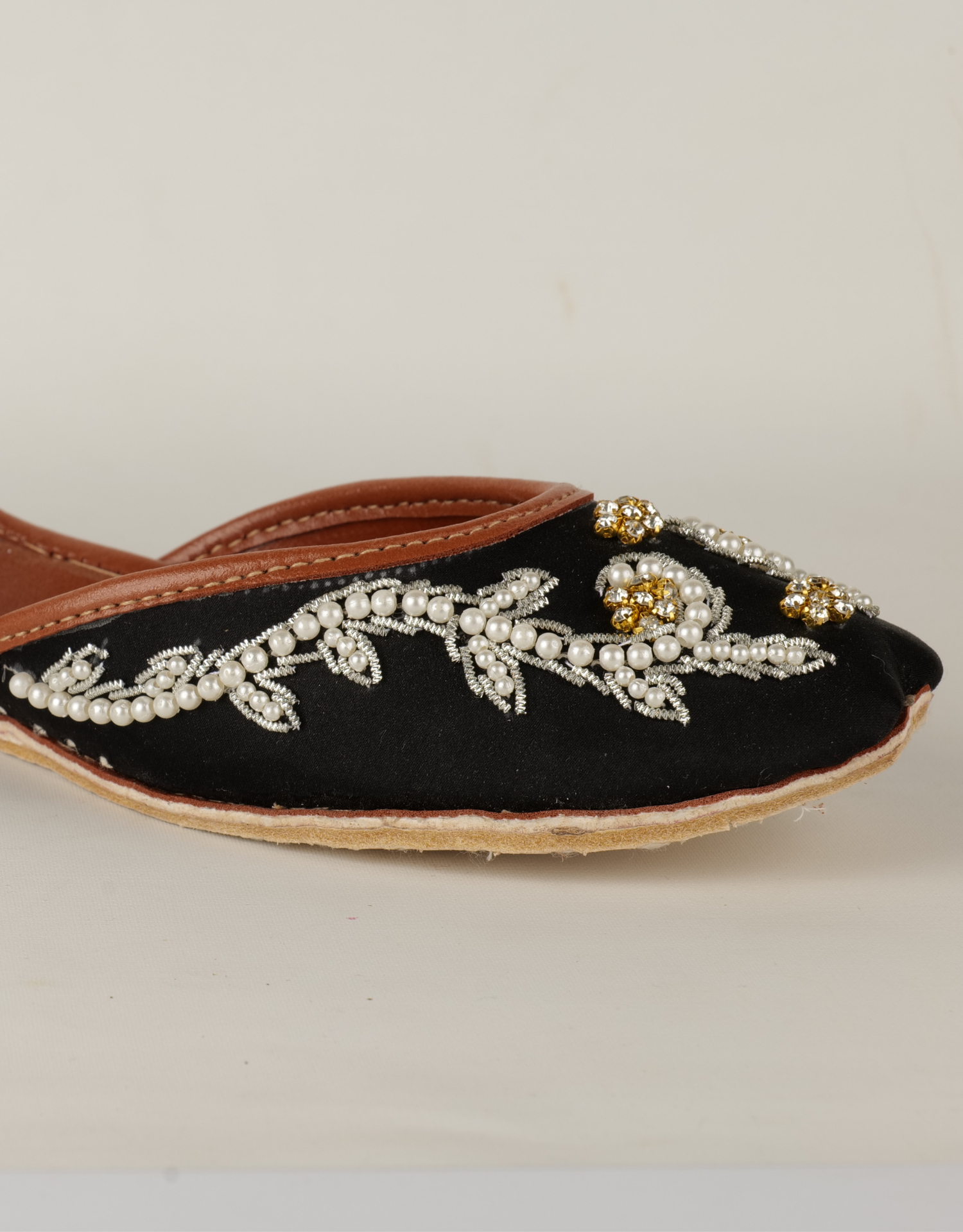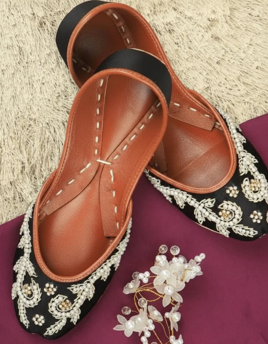 Step into elegance with these exquisite handcrafted juttis. Each pair is meticulously adorned with intricate hand embroidery featuring delicate white beads and shimmering gold sequins arranged in floral and vine motifs. The fine detailing on the classic black fabric base creates a striking contrast, making these juttis a perfect statement piece for festive occasions or elevating everyday wear.