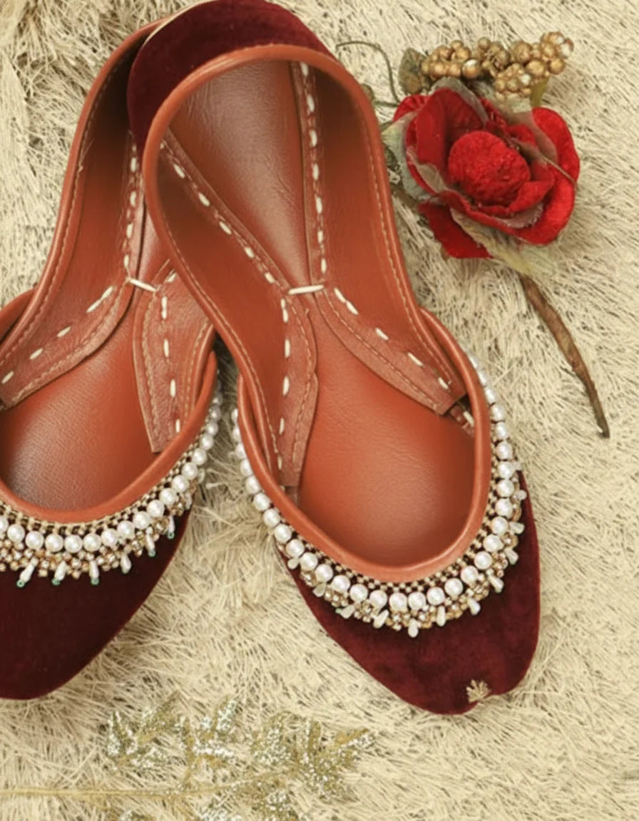 Regal Elegance! our masterpiece khussa, handcrafted on maroon silk with intricate pearl work, stone motifs, and gold cora details.