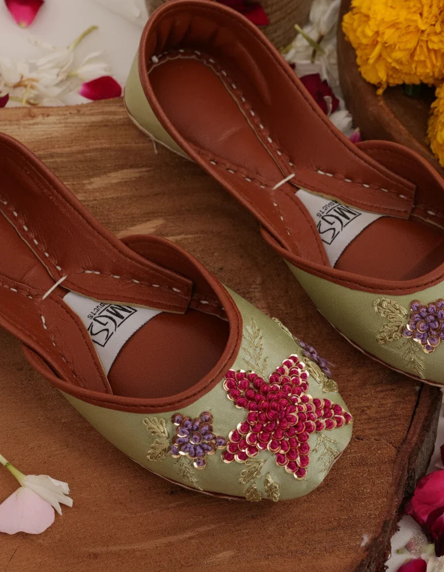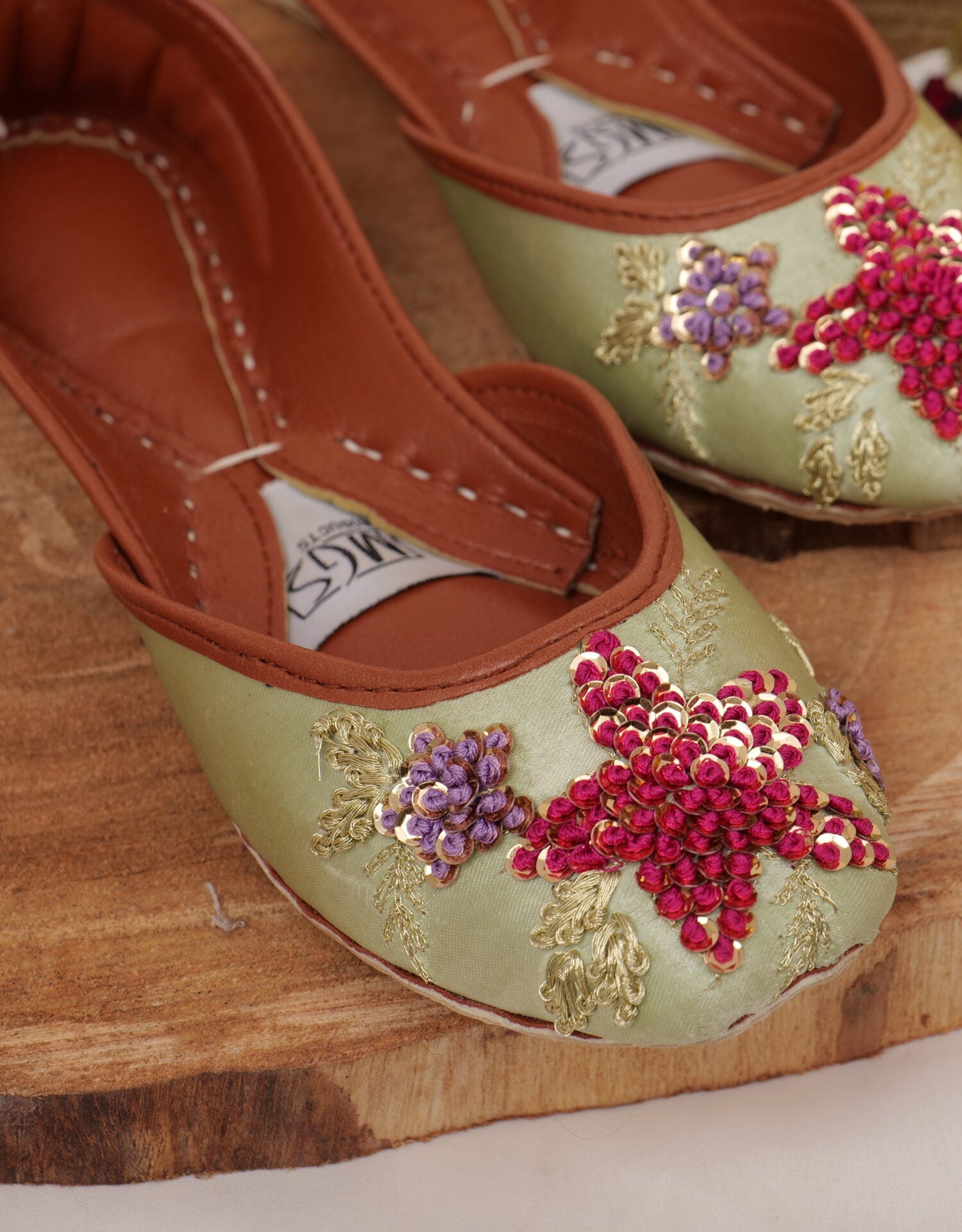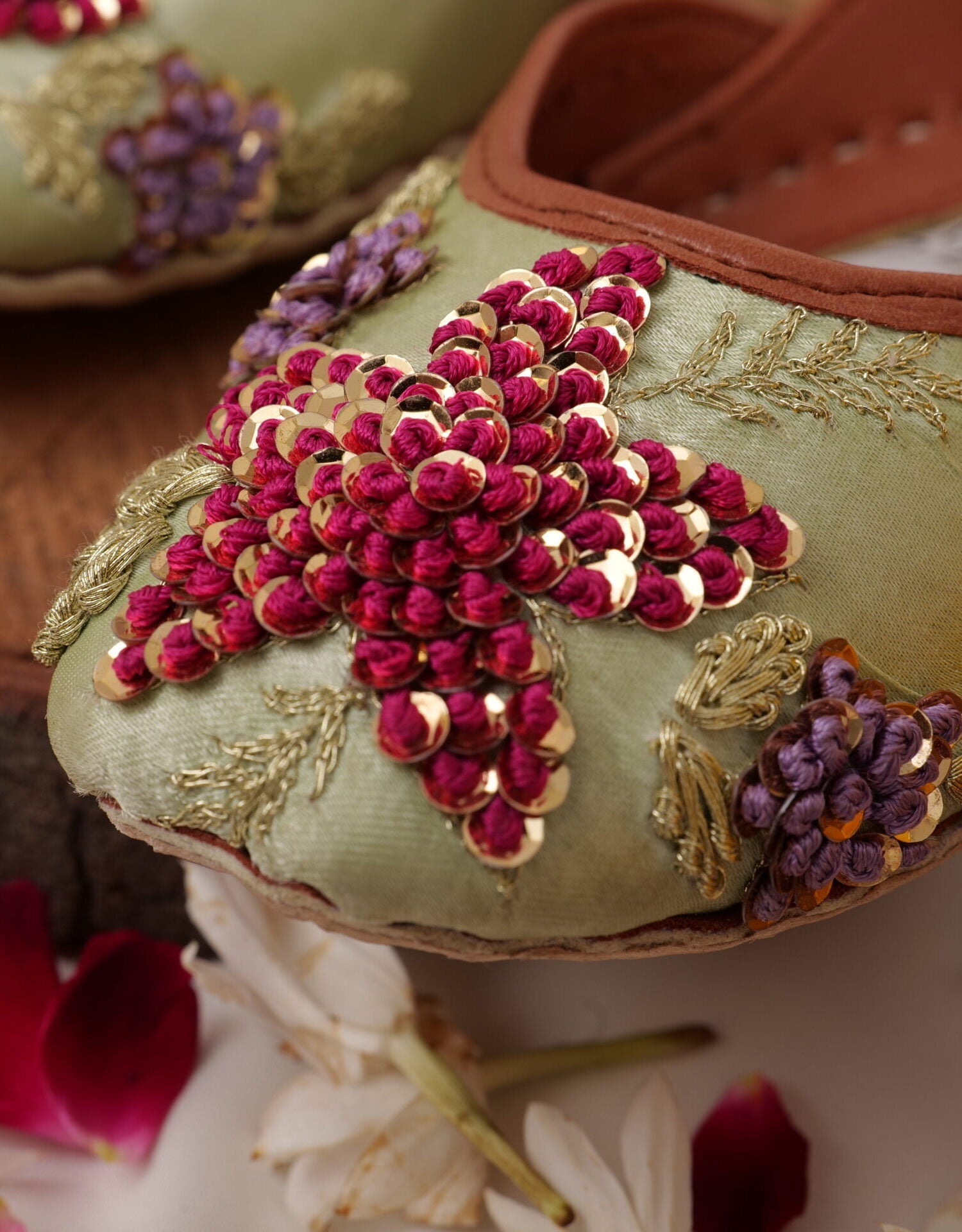 This stunning mint green khussa features intricate, hand-embroidered hot pink florals, leaves, and notes, adorned with delicate sequins. Every thread and stitch reflects the dedication and skill of our master artisans.