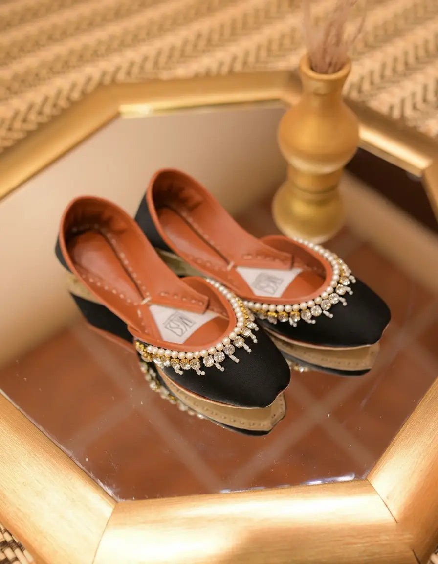 The Zarina Noir is all about royal elegance. Crafted on a smooth black satin base, this
