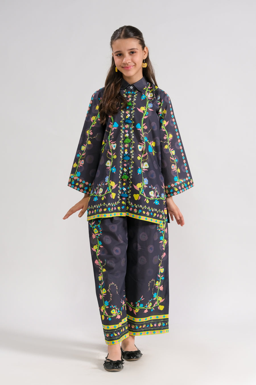 This stylish two-piece set features a vibrant floral print top in dark hues, embellished with colorful details and buttons. Paired with matching pants, it creates a chic and fun outfit that?s perfect for celebrations, making sure your little one looks fabulous!