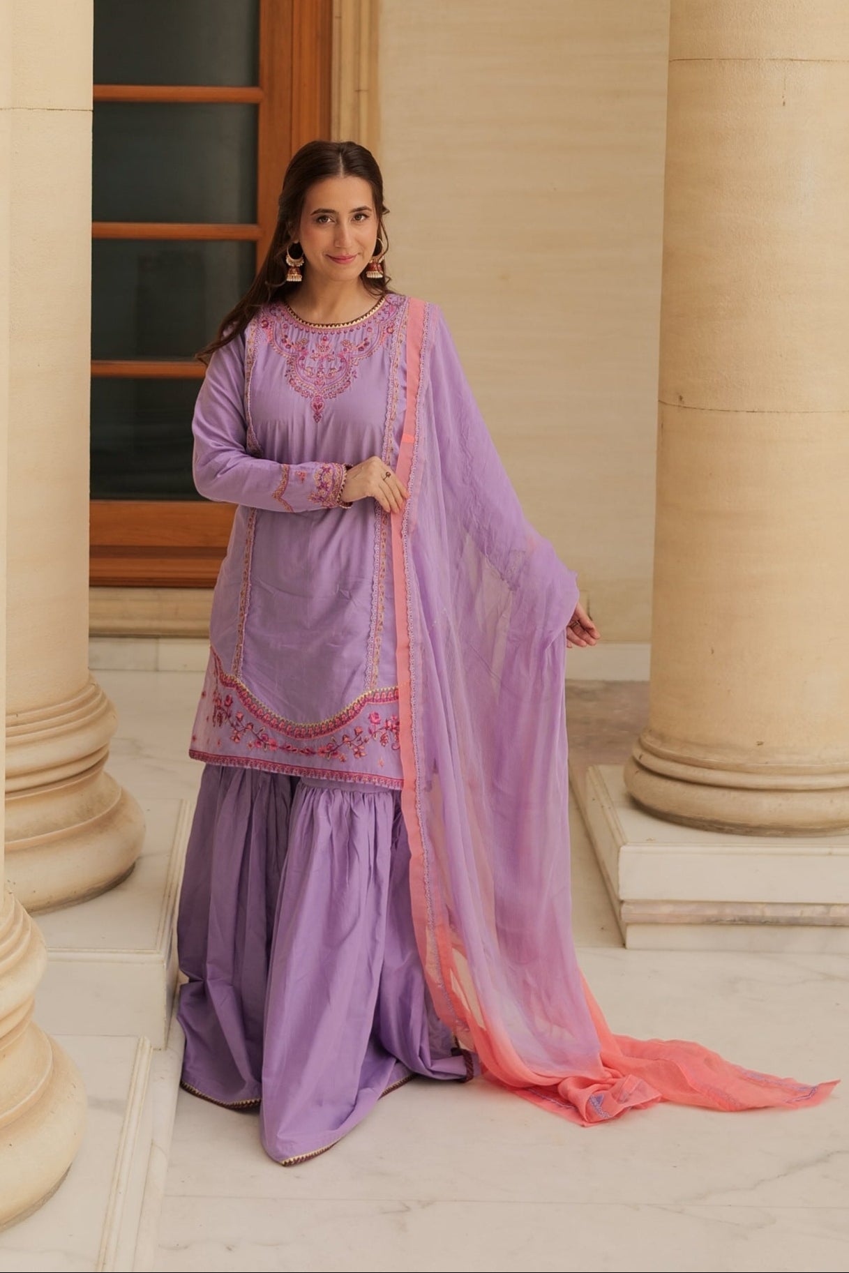 This stunning outfit features a beautifully crafted organza shirt with intricate thread and zari embroidery on the front, showcasing a majestic mihrab-inspired neckline. The daman design adds a touch of elegance, while the embroidered panels joined with GPO lace create a striking contrast. The chaaks feature contrasting paltawa and lace attachments, adding a pop of color to the overall design. The sleeves boast a delicate scallop design with piping and gota lace details, completing the intricate embroidery work. The matching Gharara is adorned with piping and gota lace details, creating a harmonious balance with the shirt. The outfit is paired with a breathtaking dip-dyed chiffon dupatta, featuring organza borders, GPO lace, and fabric triangles on the pallu.