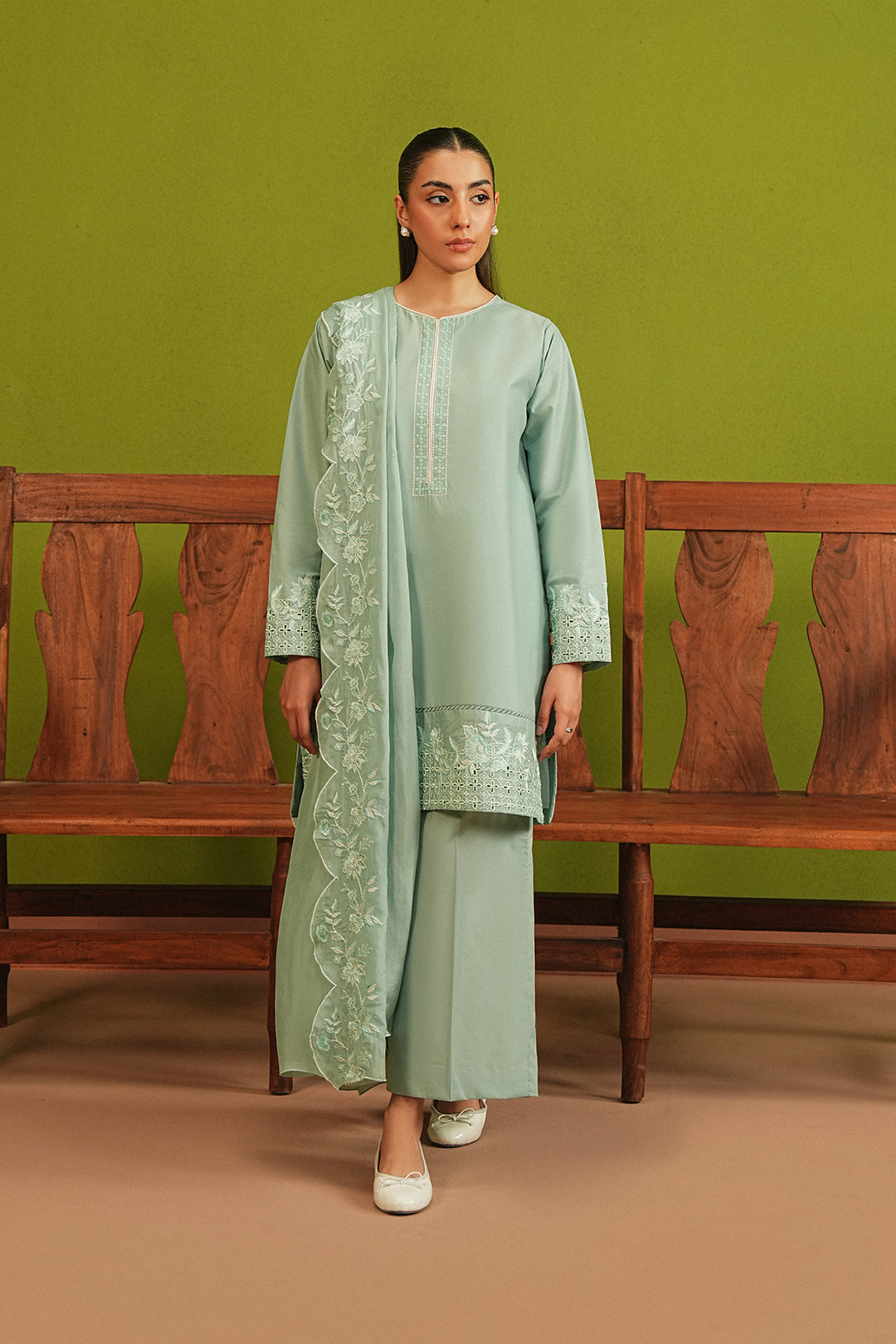 Indulge in luxury and sophistication with our Pistachio outfit. Crafted with soft lawn fabric, it offers a cool and stylish look in a beautiful ice blue hue. Designed with a flapper-style cotton lawn bottom and a delicately embroidered silk printed dupatta,