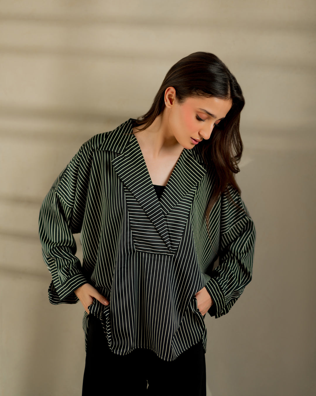 A statement in simplicity ? the Monochrome Drop-Shoulder Shirt redefines effortless style with its relaxed oversized silhouette. Designed in timeless stripes with a fluid drape, it brings comfort and sophistication together. Perfect for pairing with wide-leg trousers or denim, it?s your go-to piece for a chic, modern look.