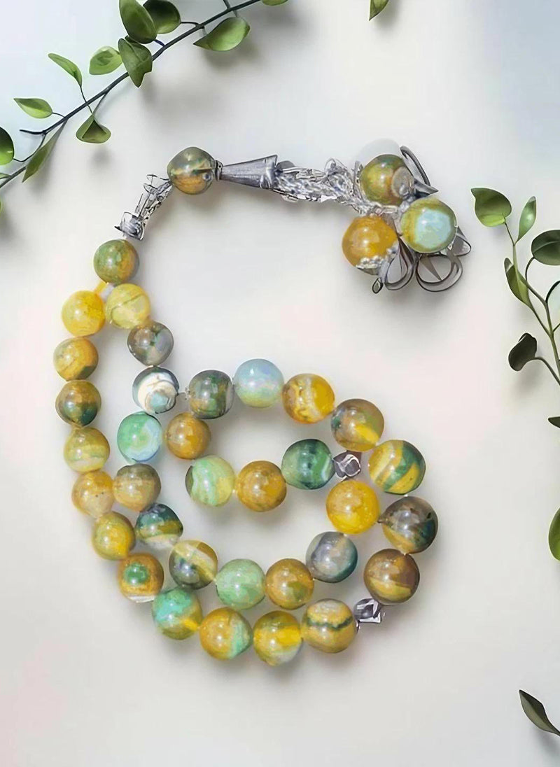 Add a vibrant touch to your spiritual practice with this stunning Multi Marble Tasbeeh, an elegant blend of natural beauty and artisan craftsmanship. Each bead is uniquely marbled in rich tones of yellow, green, blue, and earthy hues, offering a peaceful and refreshing aesthetic during your moments of dhikr.