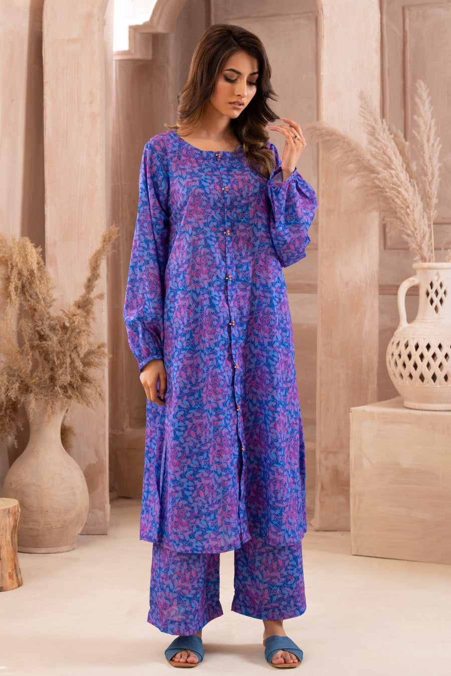 Introducing MYSTICAL ROSES - Co-ord, made of georgette fabric. This A-Line front open shirt shows a stylish digital print that will elevate any outfit. The round neckline and beads add a touch of femininity, while the sleeves gathered with detail exude elegance. Perfectly paired with flared pants for a chic and sophisticated look.