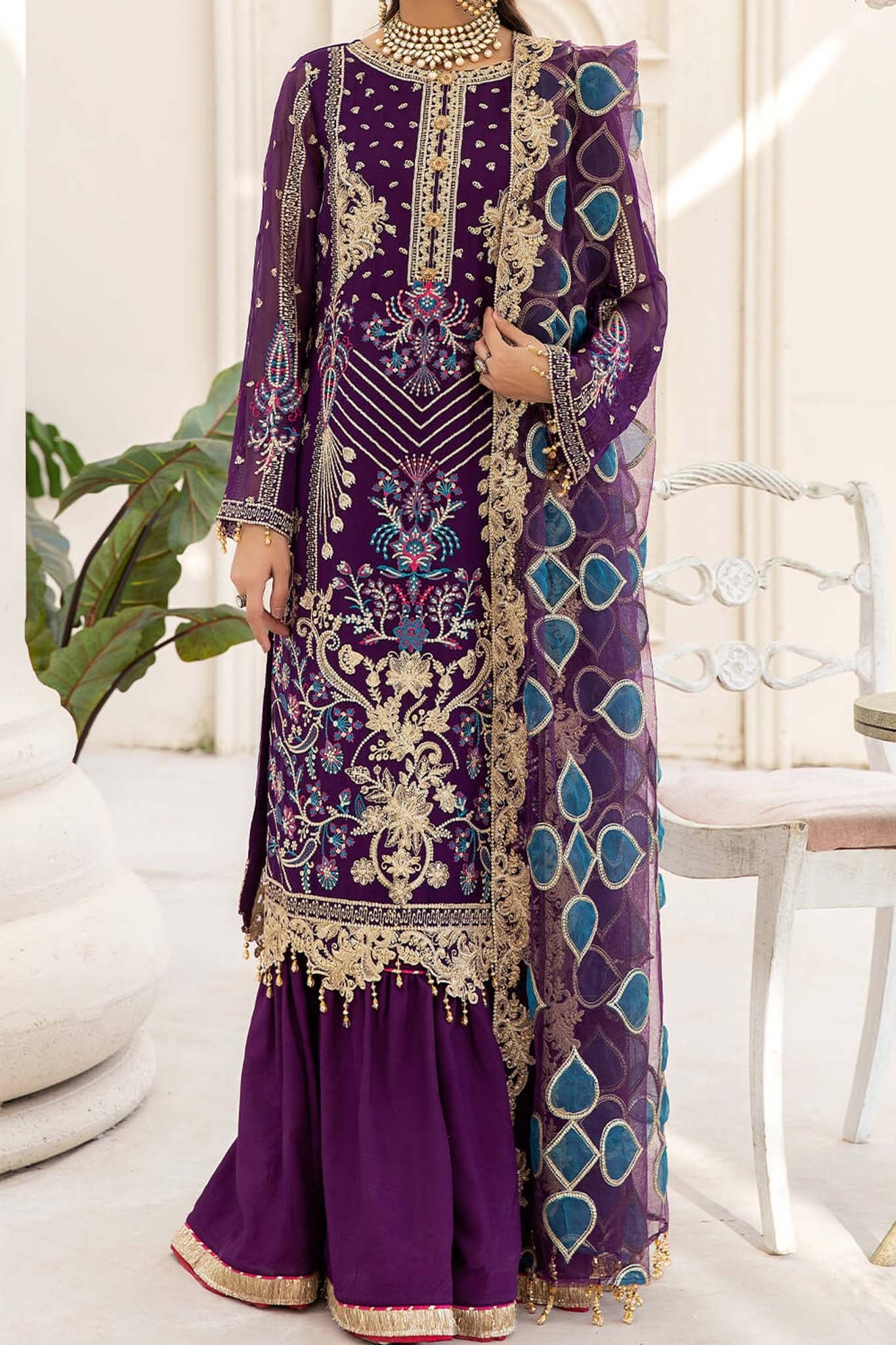 Embroidered chiffon for front. Plain chiffon for back. Embroidered chiffon for sleeves. Embroidered net & organza dupatta with cut work....