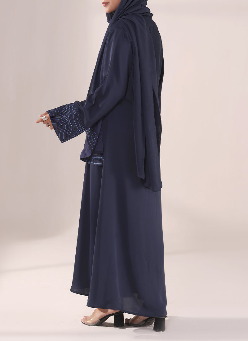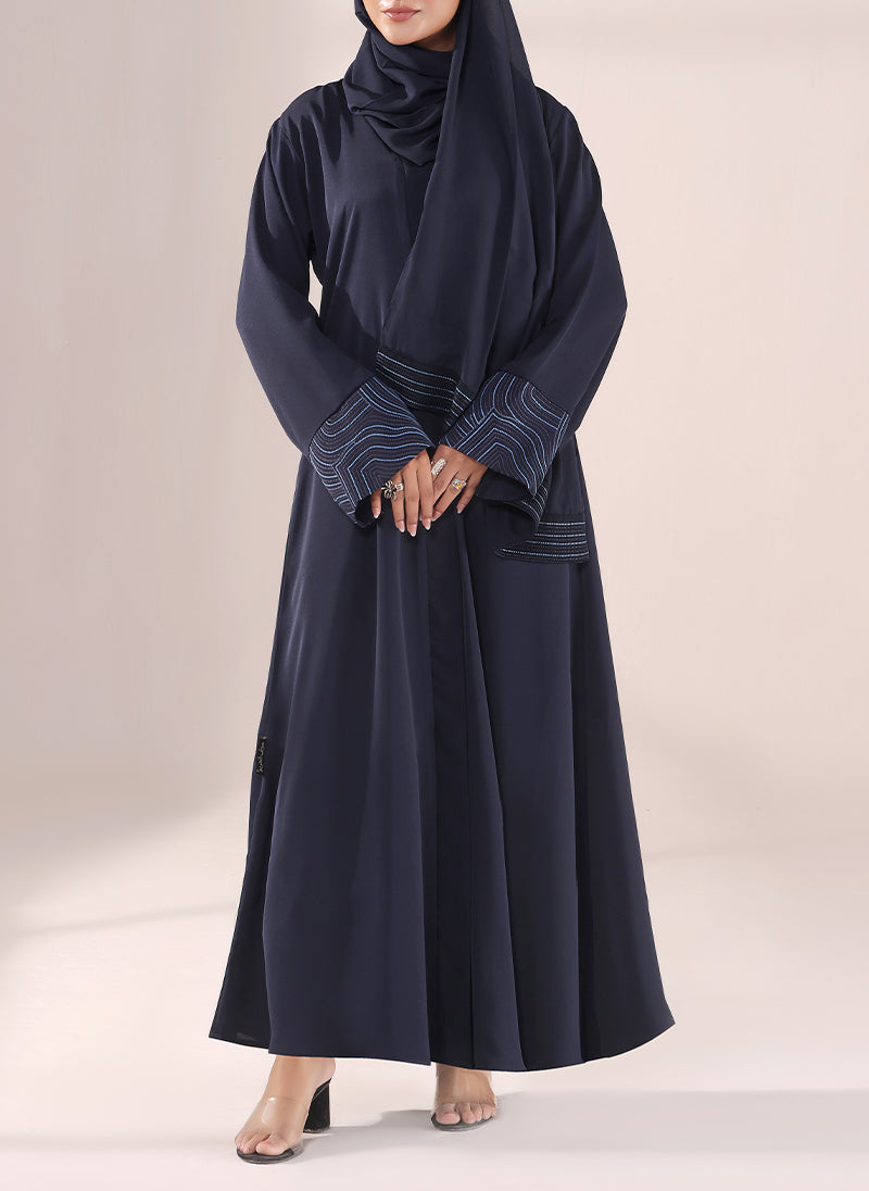 Designer Navy Nida Abaya. Experience ultimate comfort with premium, soft Nida fabric and an elegant drape. Features contemporary line embroidery on the sleeves for a modern, modest finish. Shop the look of luxury!