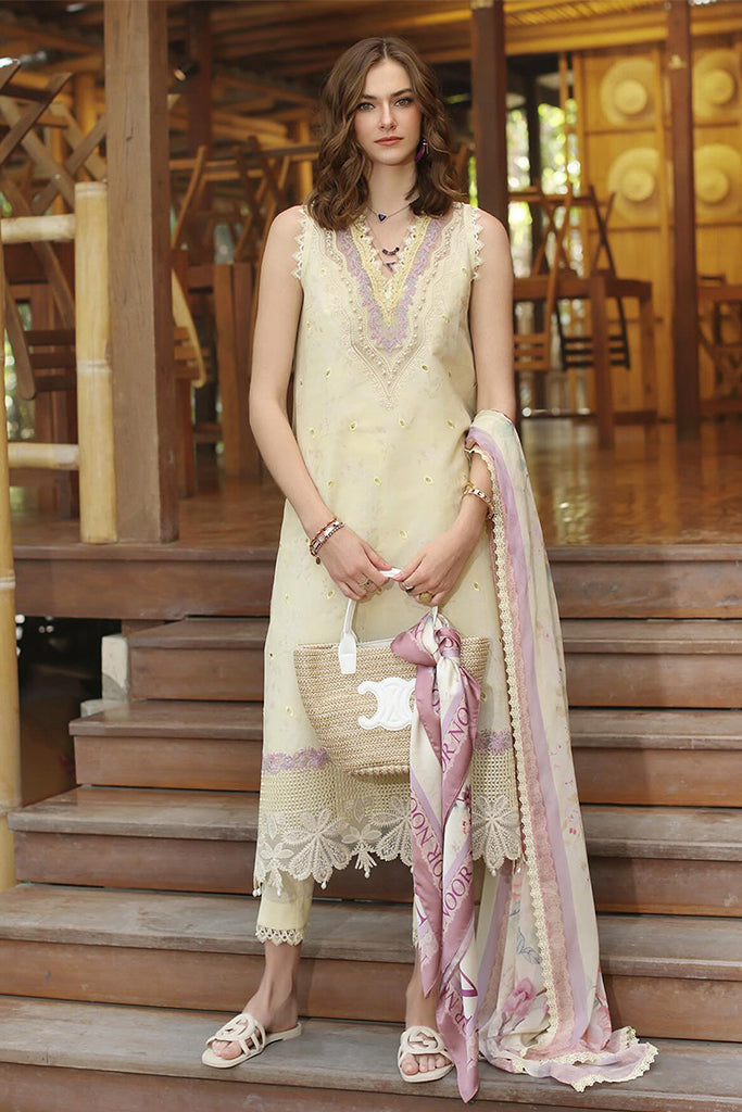 Schiffli embroidered digital printed lawn frontDigital printed lawn backDigital printed lawn sleevesDyed cambric pantsDigital printed chiffon dupattaEmbroidered necklineEmbroidered hem borderEmbroidered sleeves border