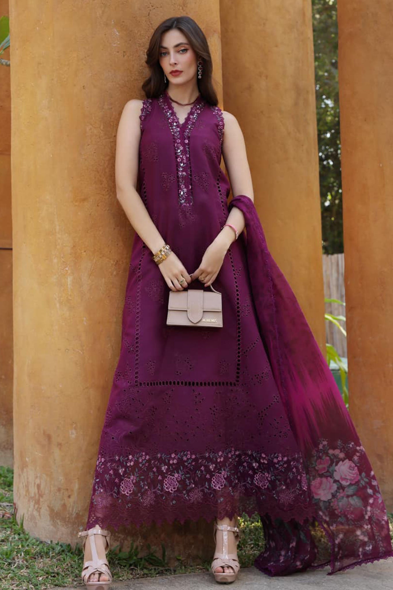 Schiffli embroidered lawn front center & side pannels Embroidered lawn back Schiffli embroidered lawn sleeves Dyed cambric trouser Digital printed chiffon...