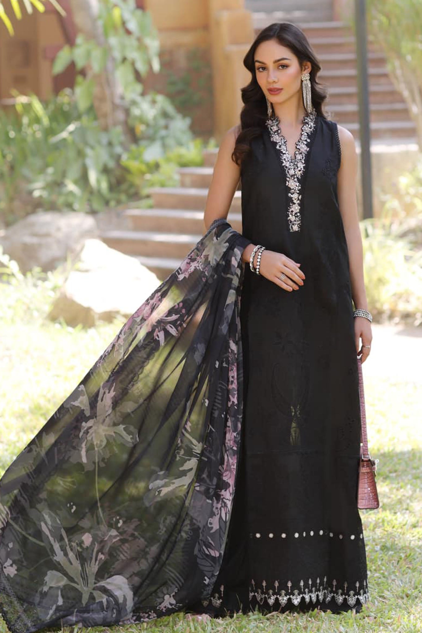 Laser schiffli embroidered lawn front center panel & schiffli embroidered side panels Dyed lawn back Schiffli embroidered lawn sleeves Dyed...