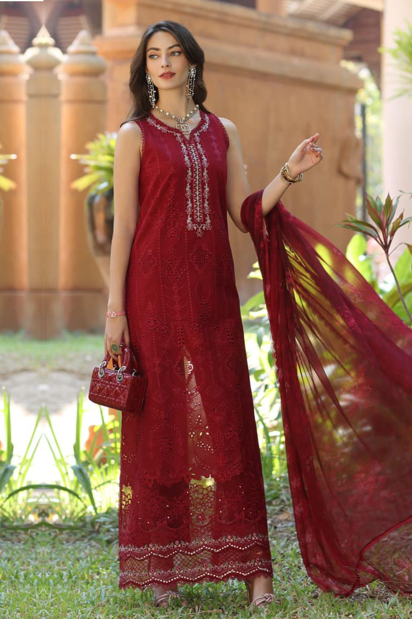 Schiffli & panni embroidered lawn front Dyed lawn back Schiffli embroidered lawn sleeves Dyed cambric trouser Digital printed chiffon dupatta...