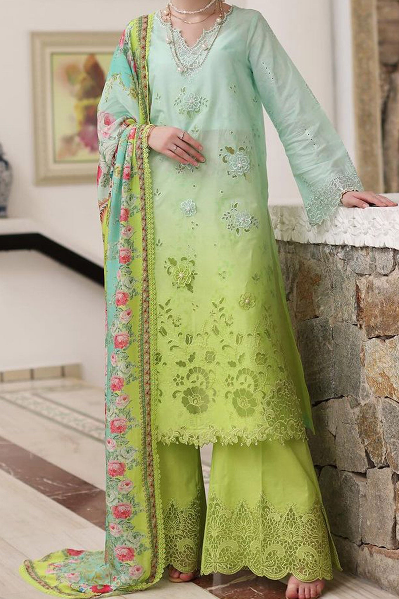 Digital printed ombre laser embroidered lawn front Digital printed ombre lawn back Digital printed schiffli embroidered lawn sleeves Dved cambric...