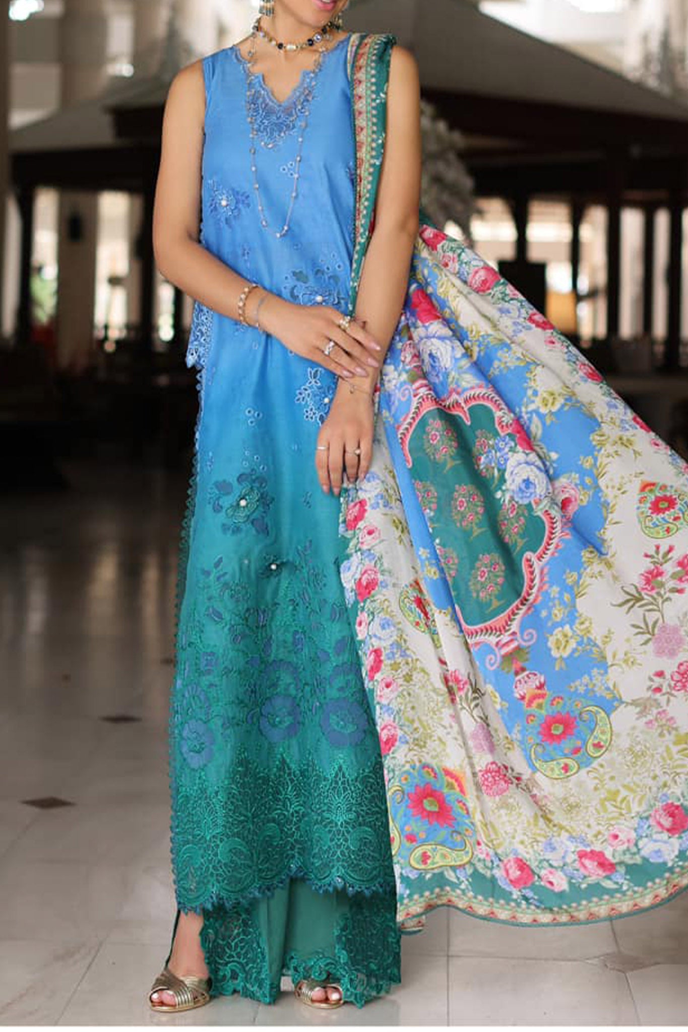 Digital printed ombre laser embroidered lawn front Digital printed ombre lawn back Digital printed schiffli embroidered lawn sleeves Dved cambric...