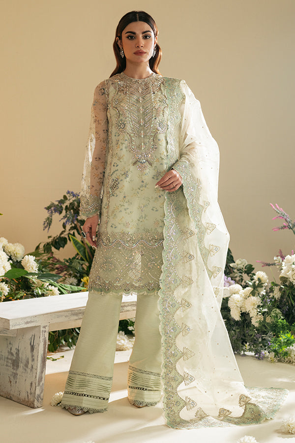 Indulge in elegance with Nuria, a luxurious mint green formal ensemble. The organza shirt features exquisite pearls, stones, and thread work, while the accompanying raw silk trousers and printed organza dupatta with decorated borders complete the look. Nuria is a masterpiece that seamlessly blends dramatic silhouettes and intricate embellishments, ensuring it becomes a cherished addition to your wardrobe.