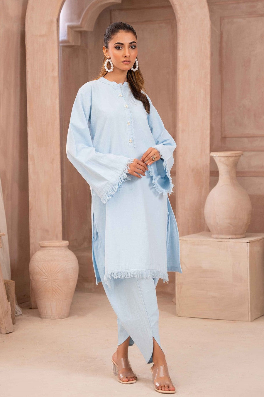 Ocean fascinating ensemble is perfect for a trendy look. Self textured Lawn shirt with stand collar, pearl buttons, textured sleeves and daaman. The matching pants also fit the cool aesthetic this design aims towards.