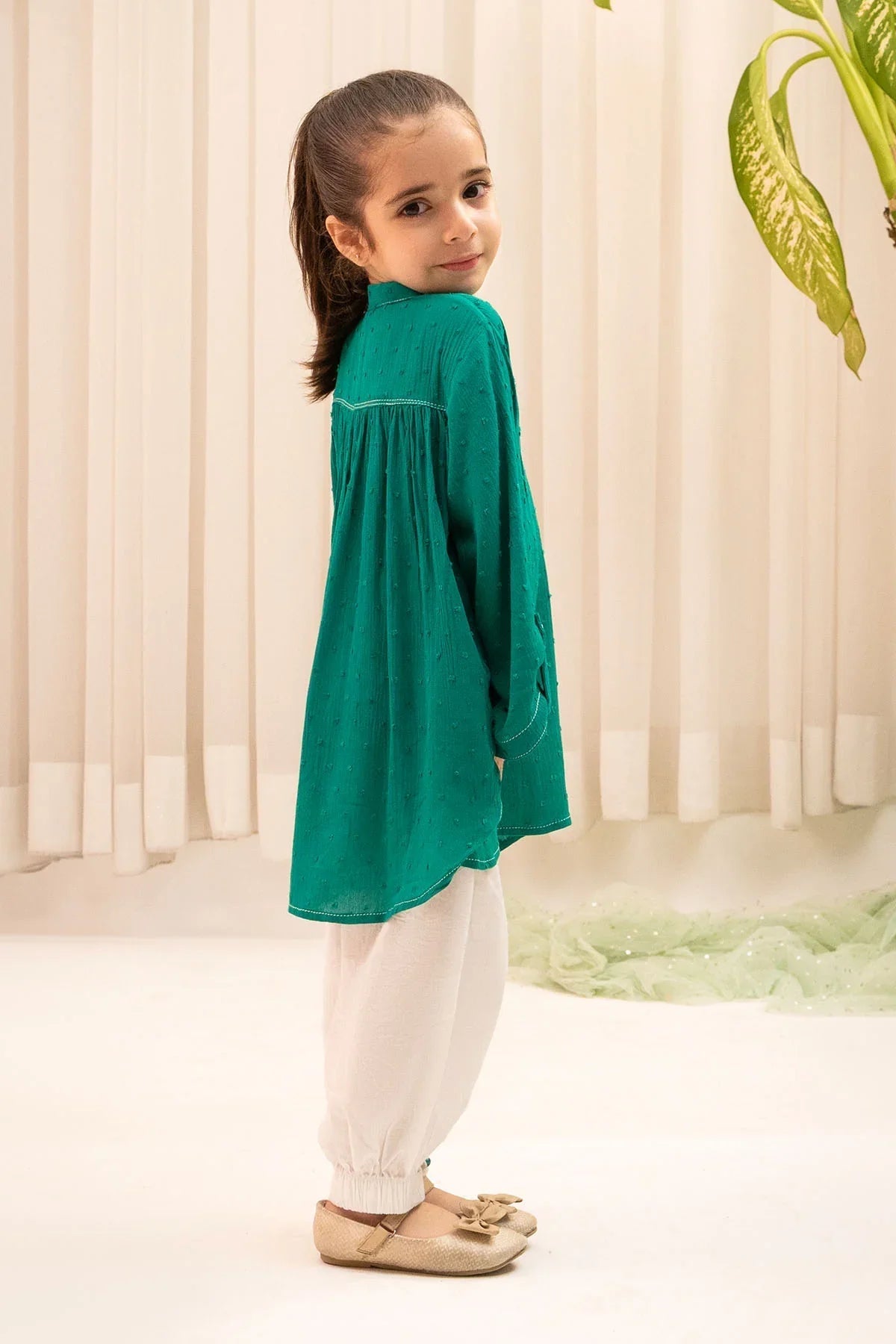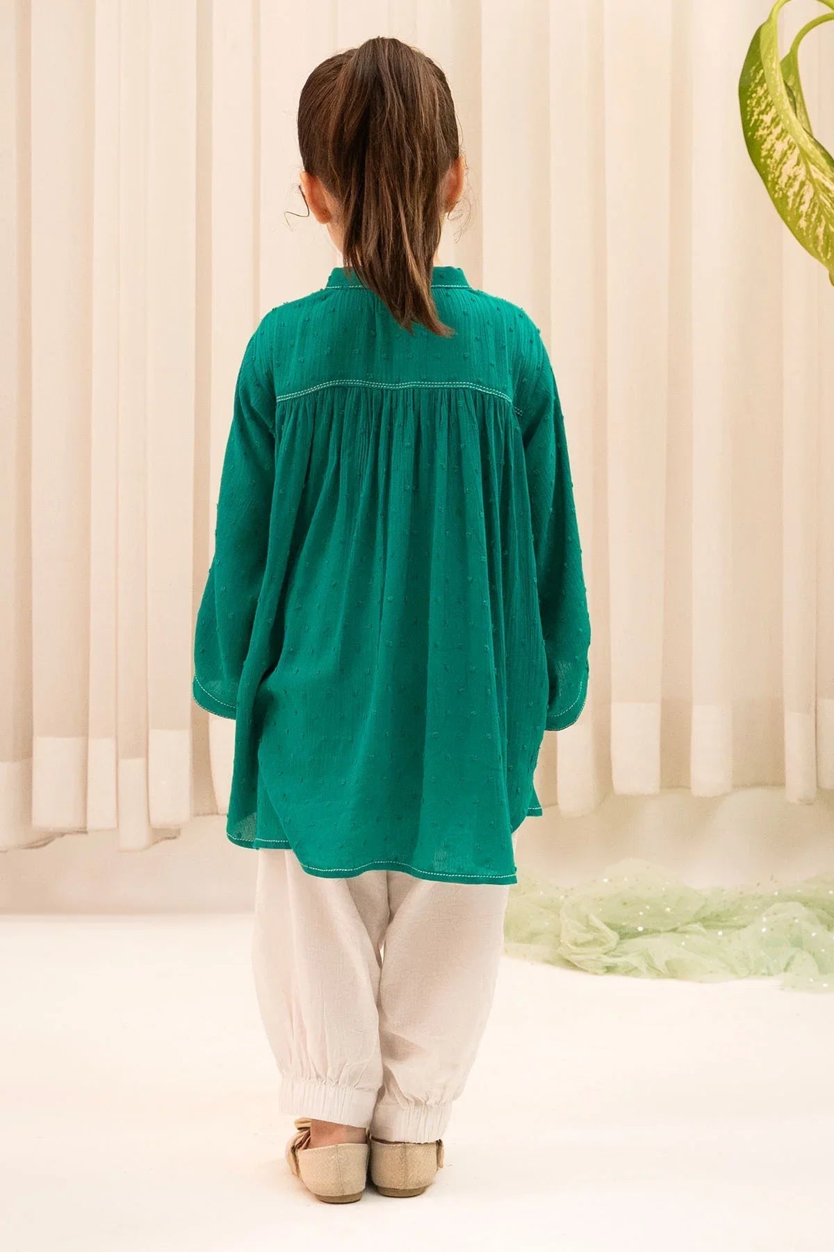 Top: Green Brochia Cotton Kurta Bottom: White Cotton Trouser