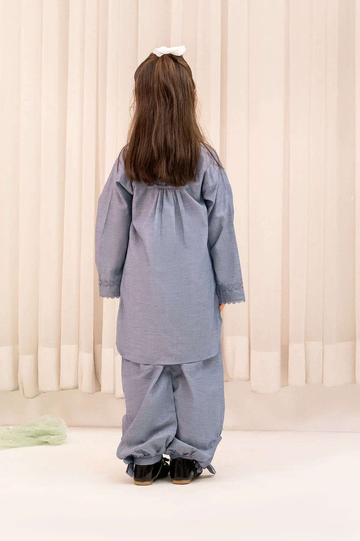 Top: Blue Chambray Cotton Kurta With Crotia Laces Bottom: Blue Chambray Cotton Trouser