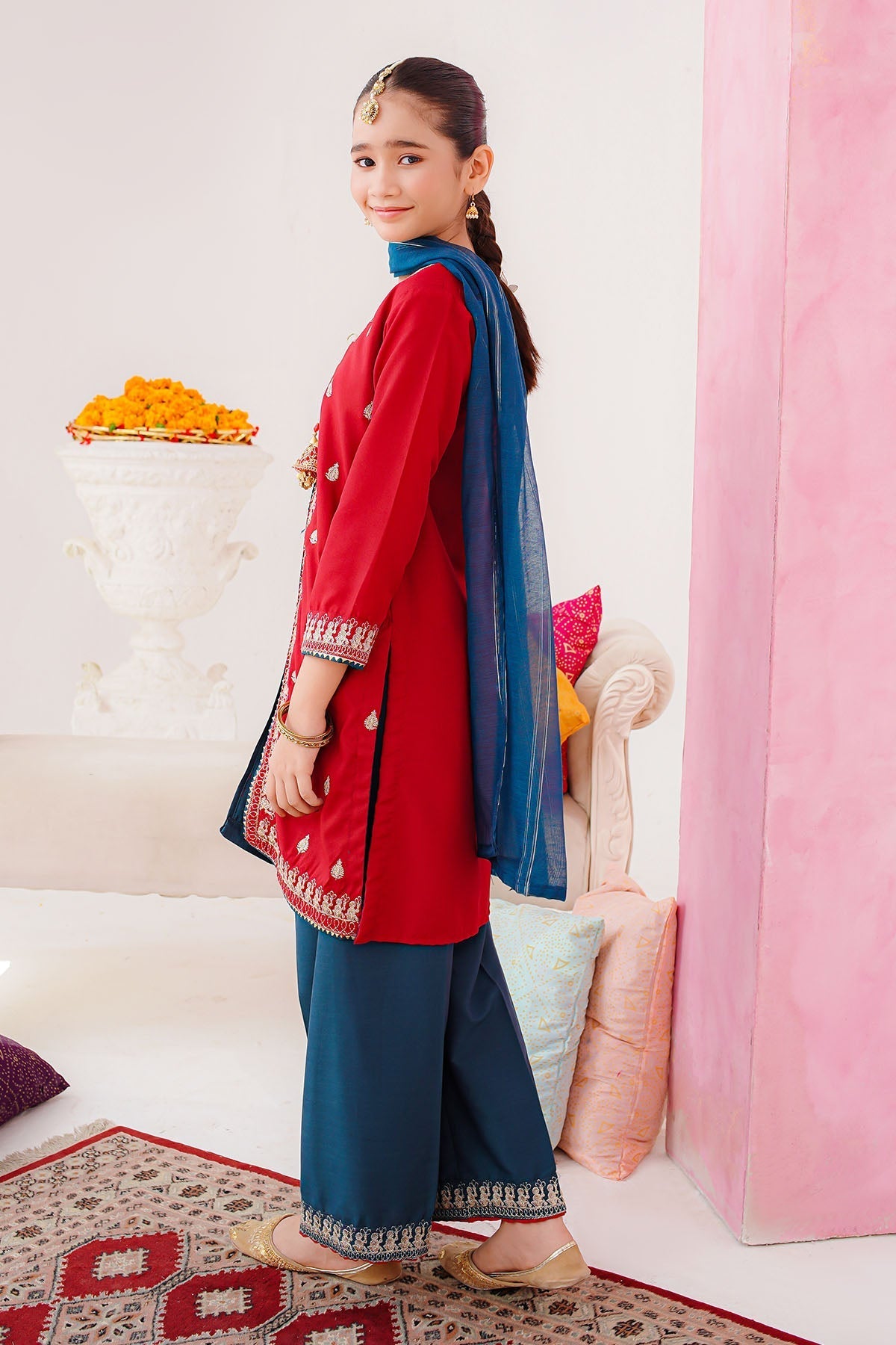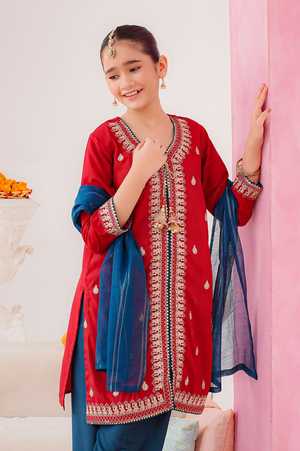Top: Maroon Raw Silk Kurta With Embroidery and TasselsBottom: Teal Blue Raw Silk Trouser With EmbroideryDupatta: Teal Blue Khaddi Net Dupatta