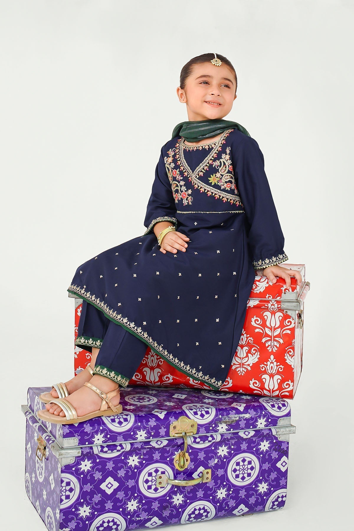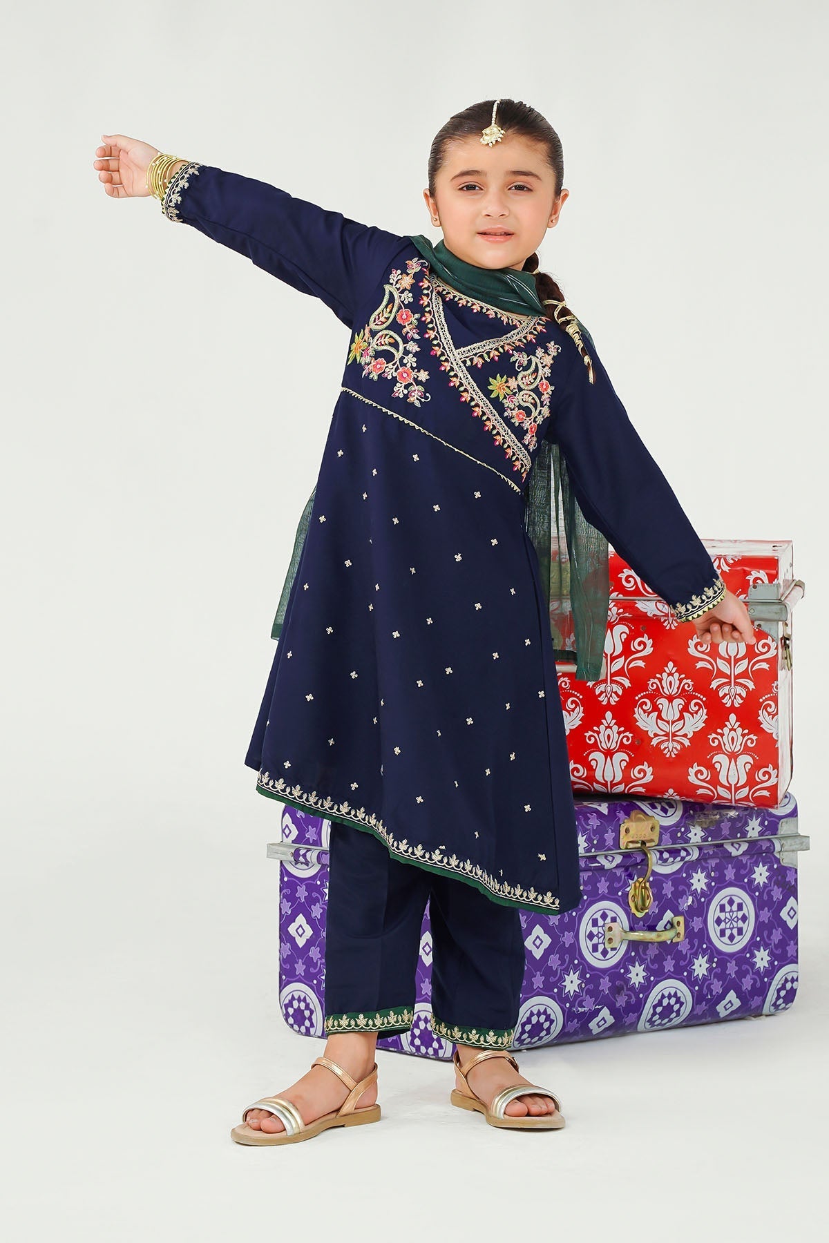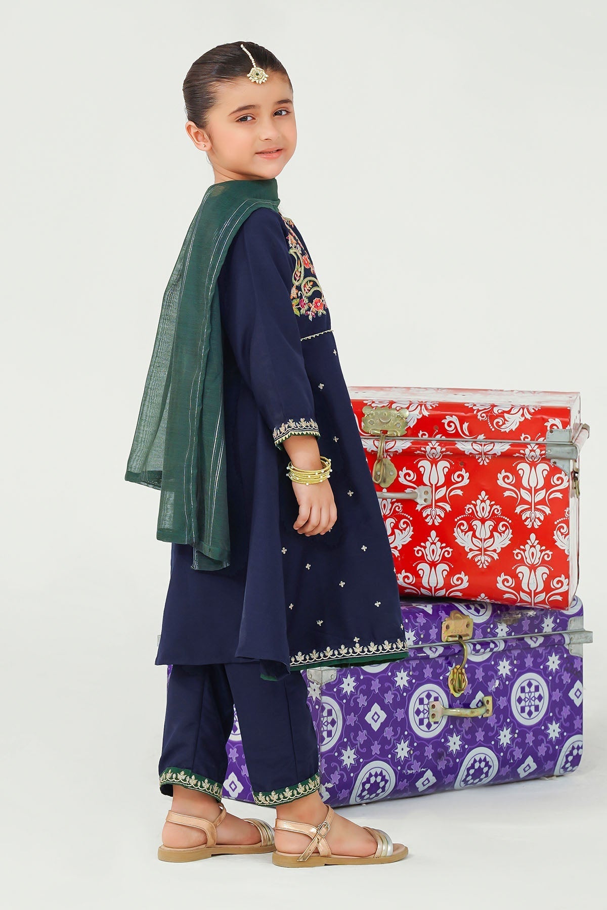 Top: Navy Blue Raw Silk Kurta With EmbroideryBottom: Navy Blue Raw Silk Trouser With Embroidery LaceDupatta: Dark Green Khaddi Net Dupatta