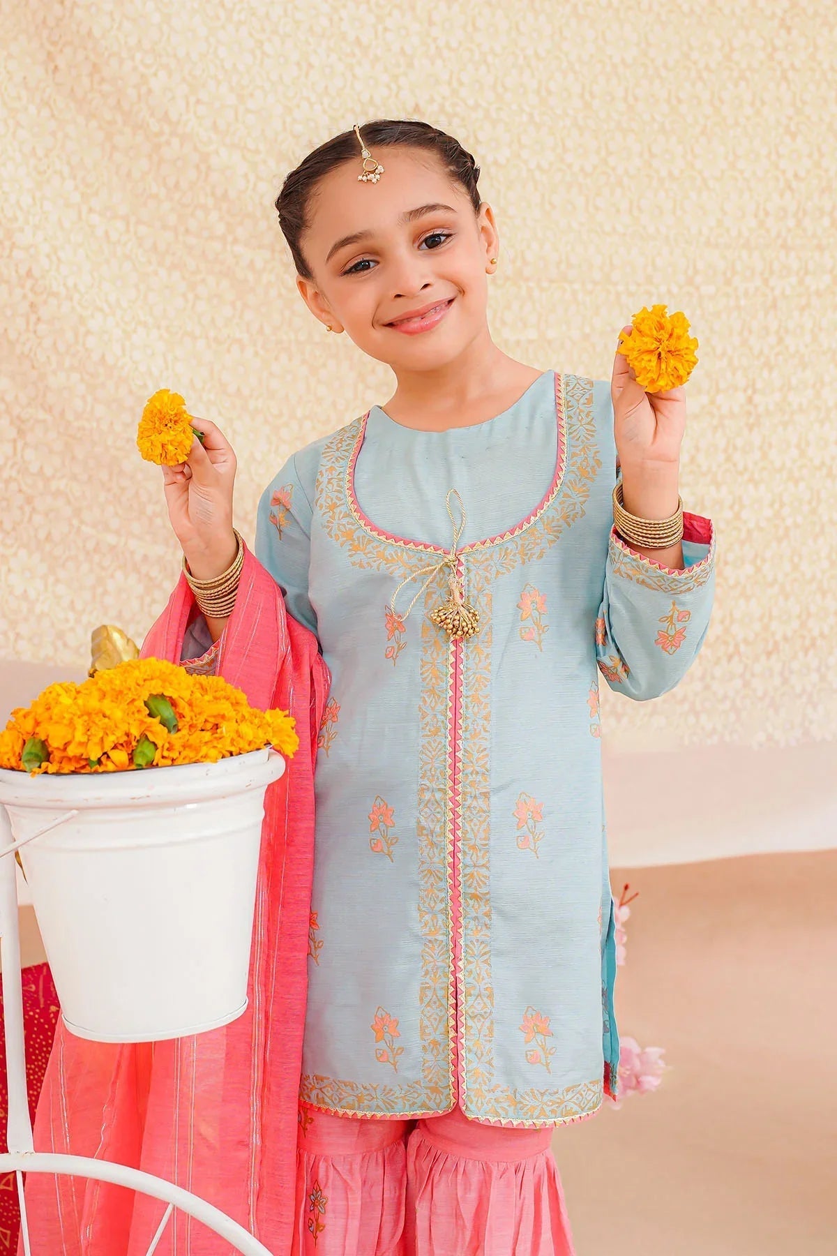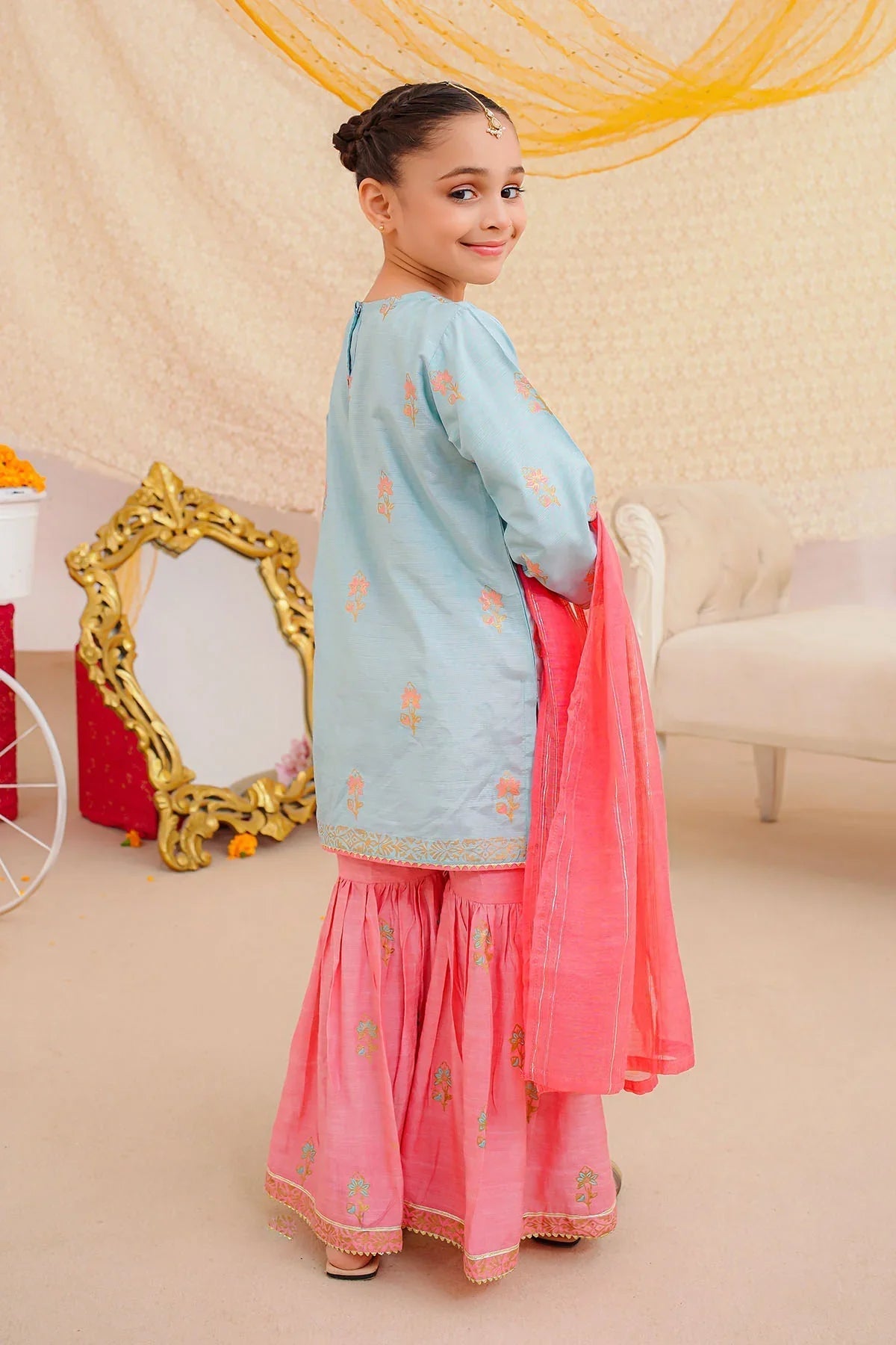 Top: Mint Cotton Silk Kurta With Block Print and TasselsBottom: Candy Pink Cotton Silk Gharara With Print Dupatta: Candy Pink Khaddi Net Dupatta