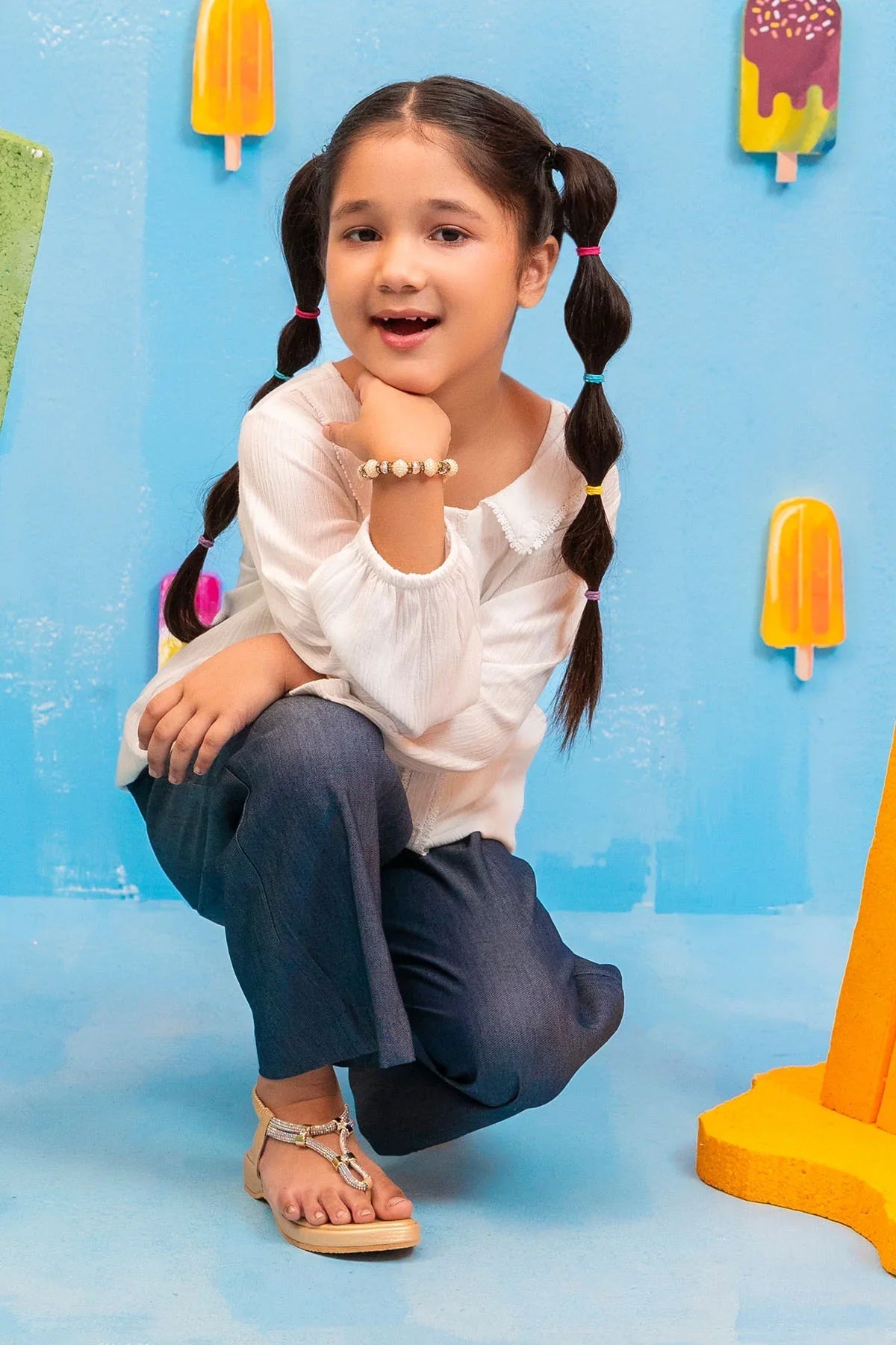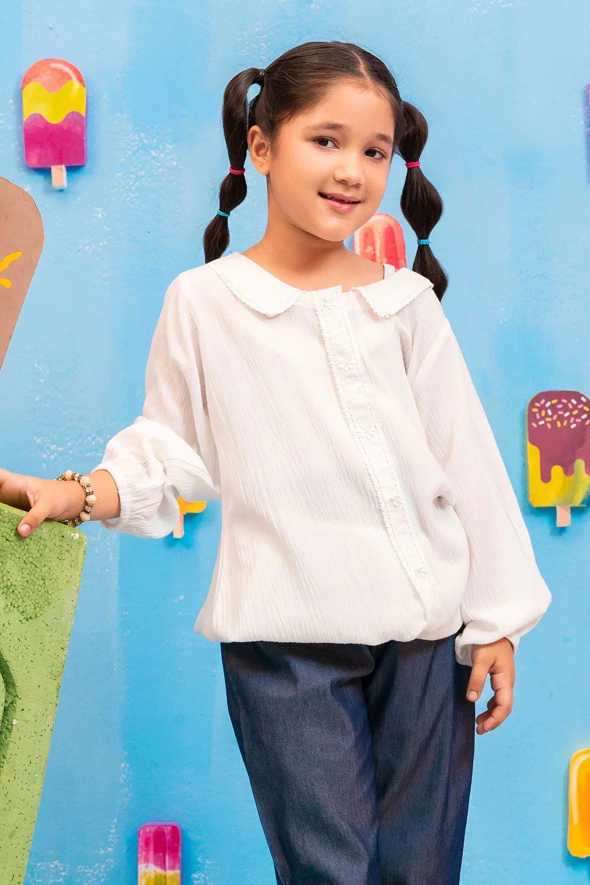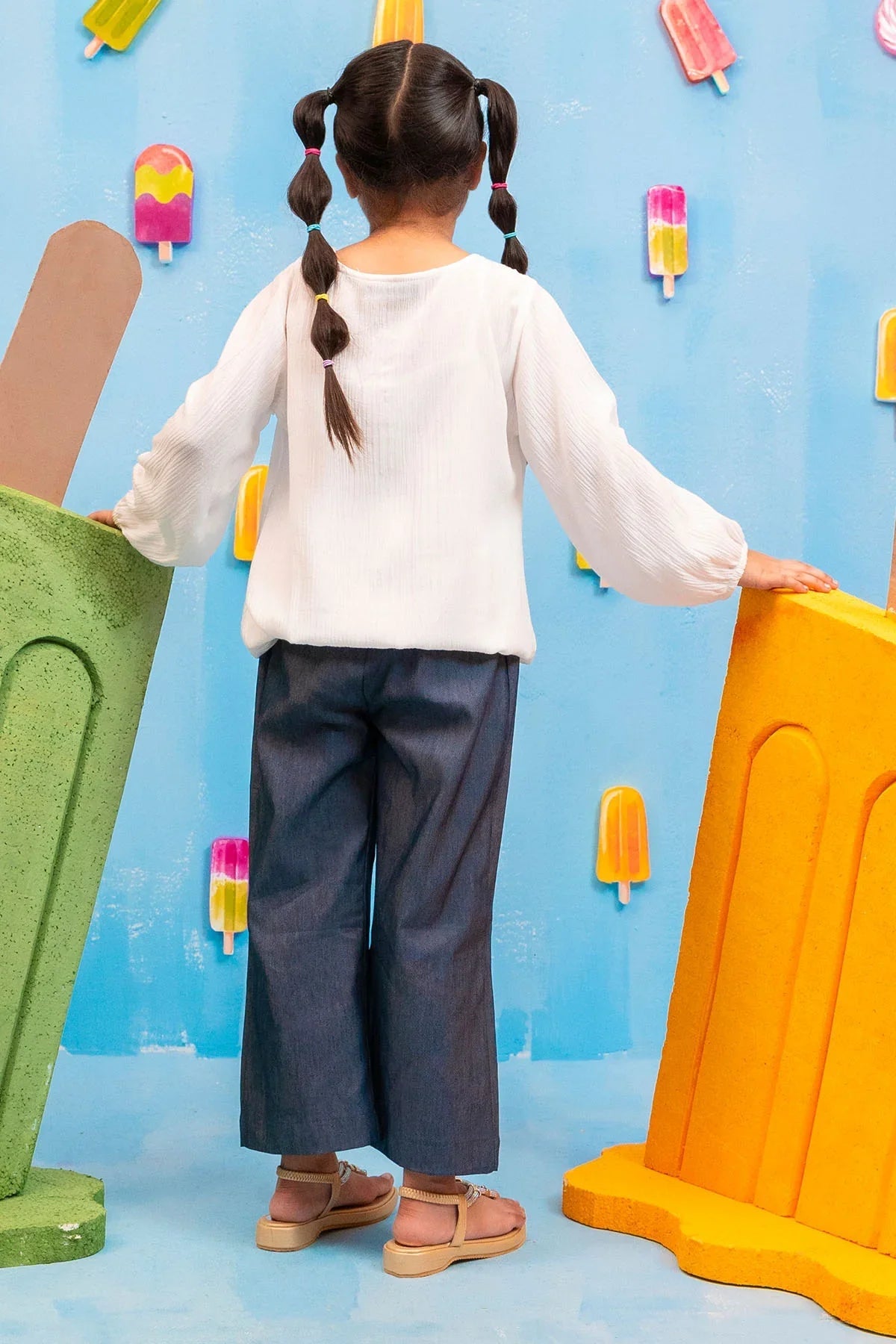 Top: White Cotton Cheese Cloth Top With LacesBottom: Dark Blue Denim Trouser