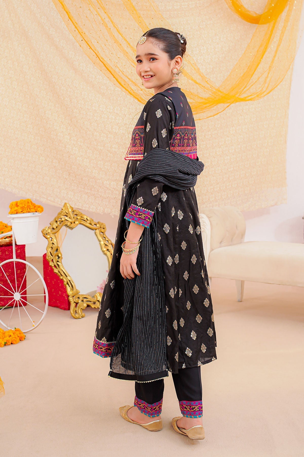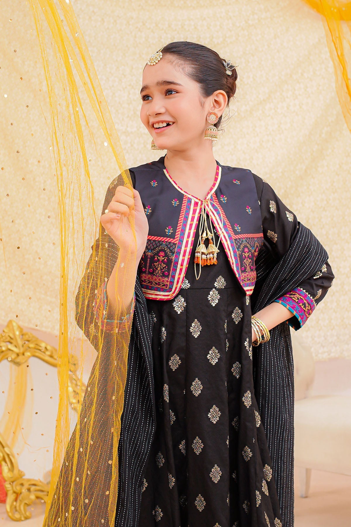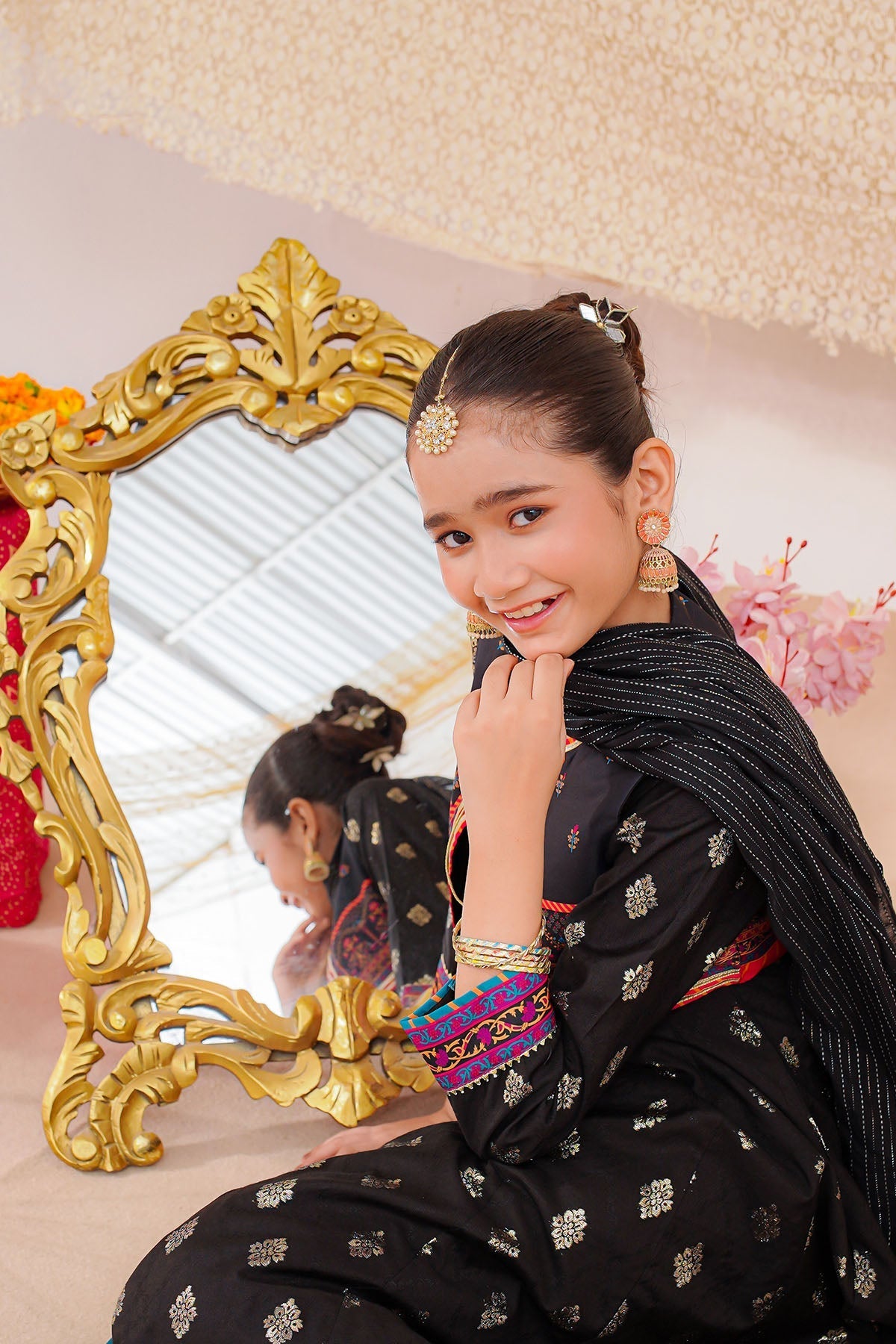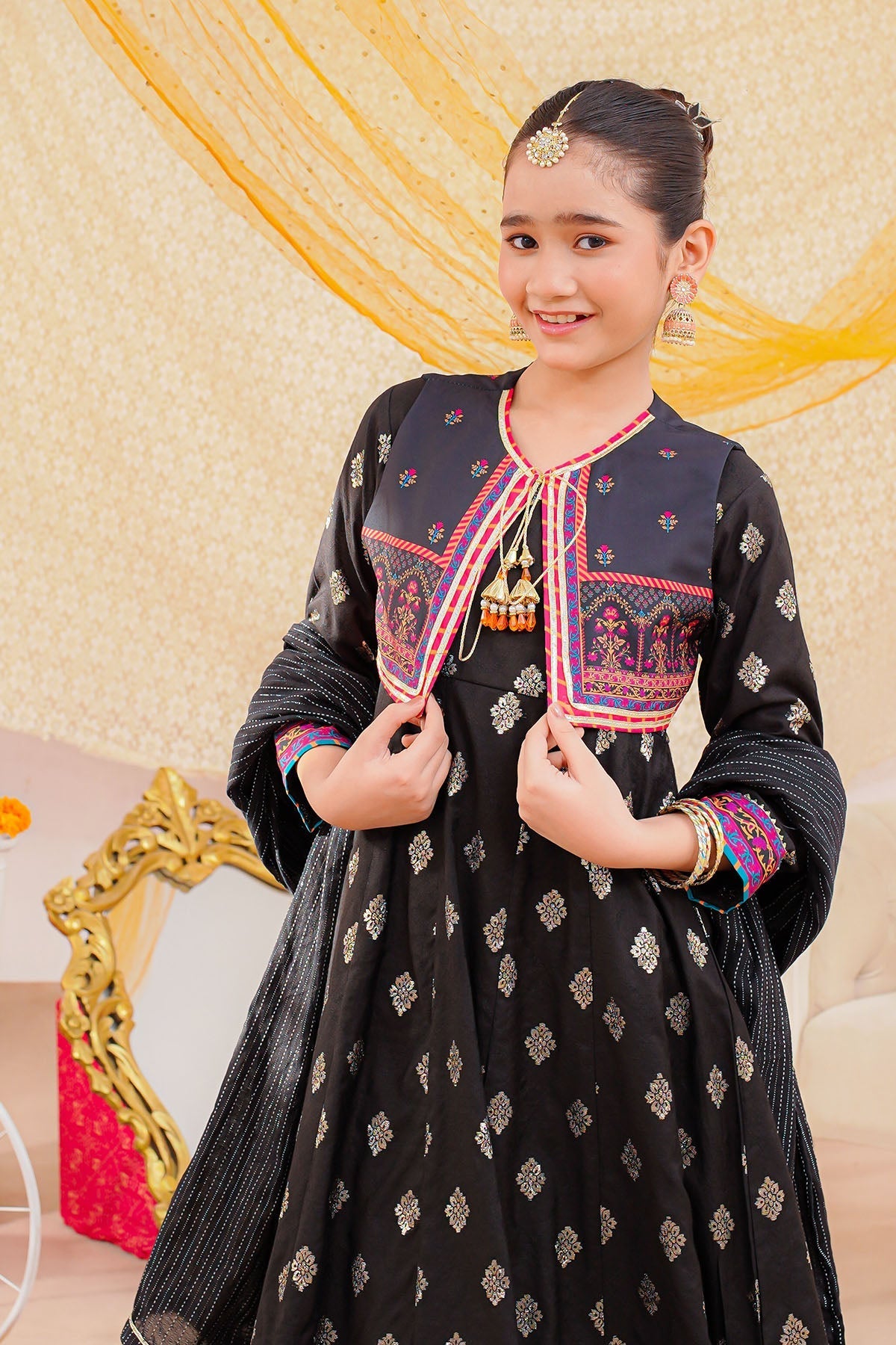 Top: Black Cotton Jacquard Maxi With Malai Crepe Digital Printed Koti and Tassels
