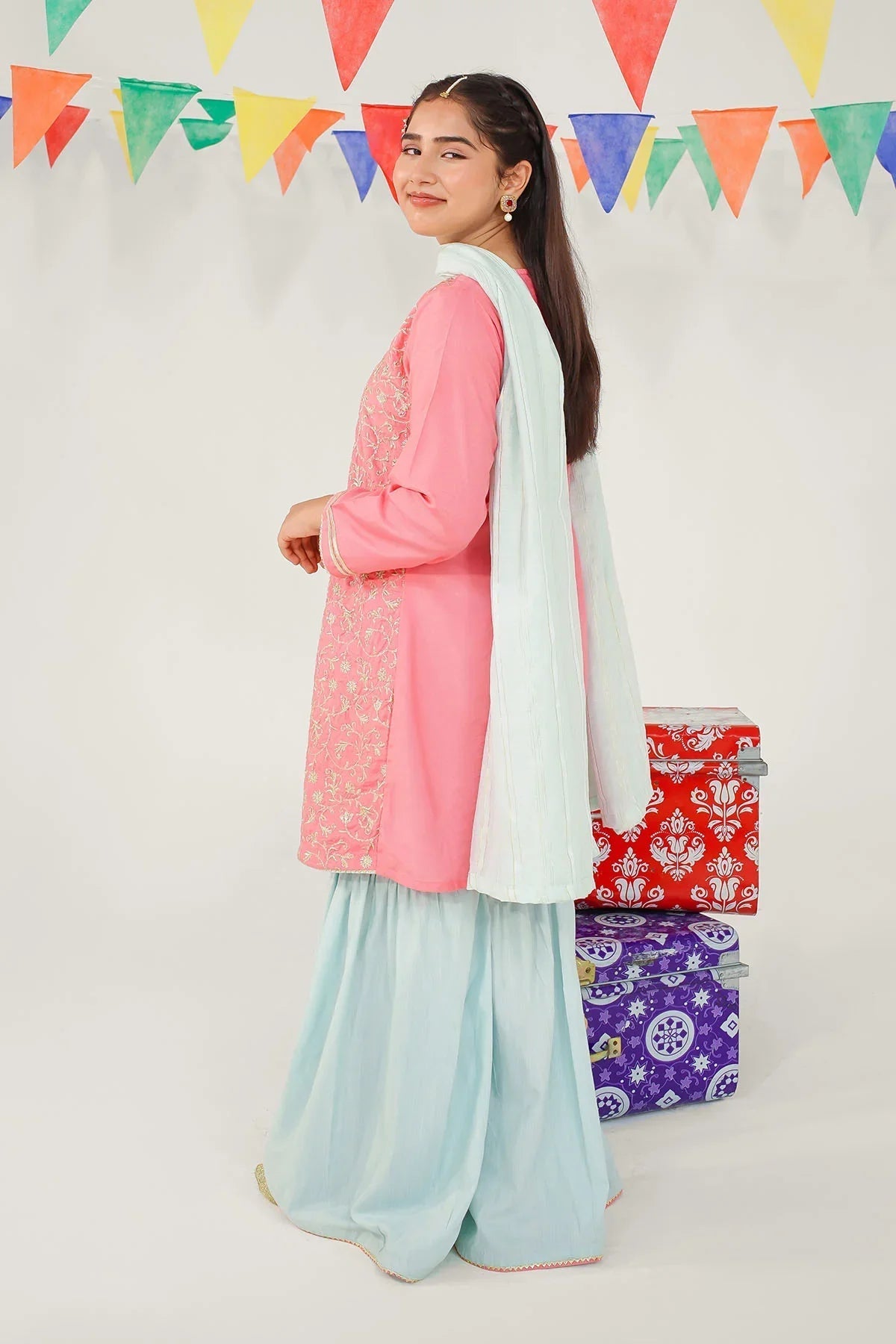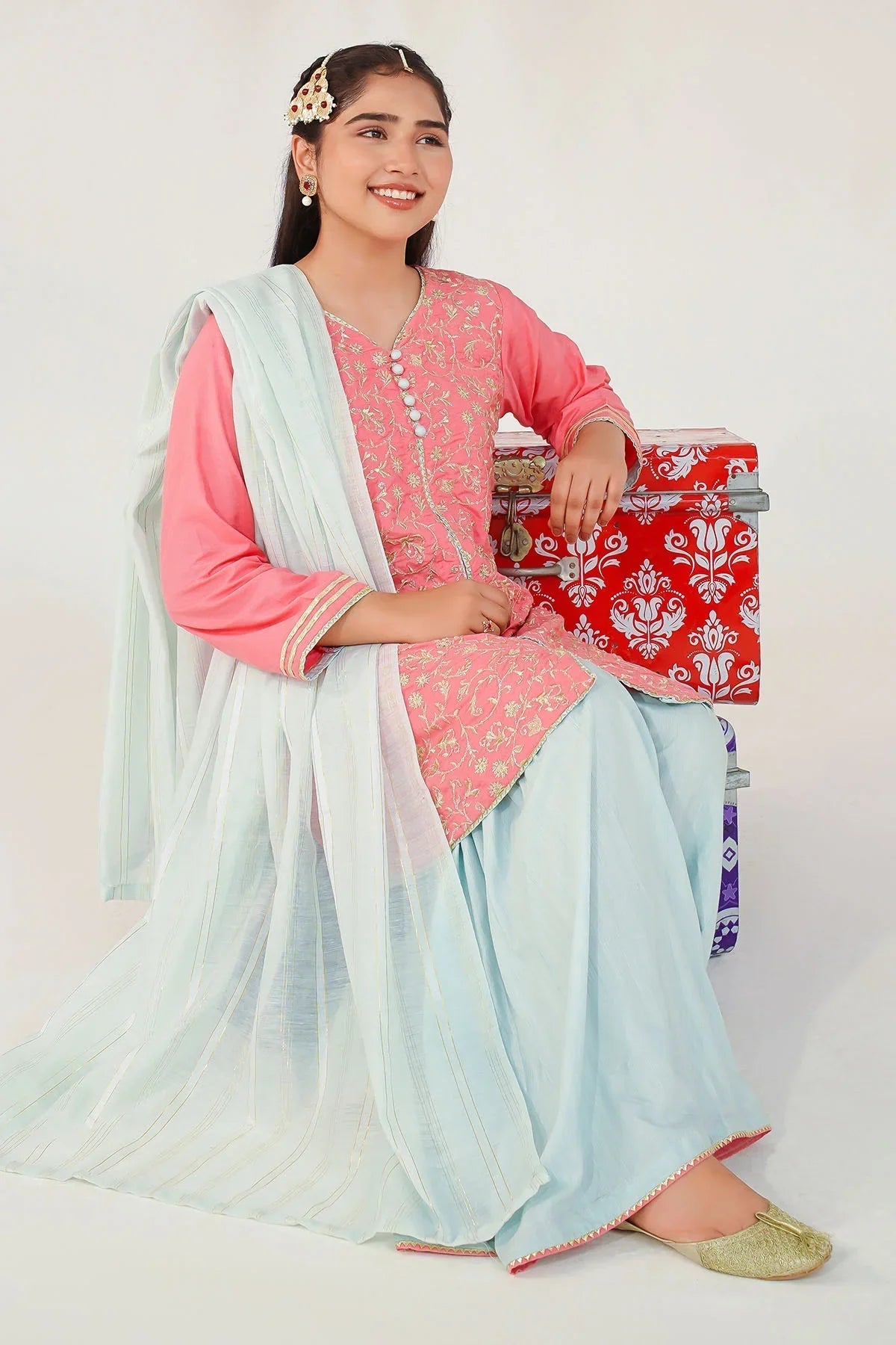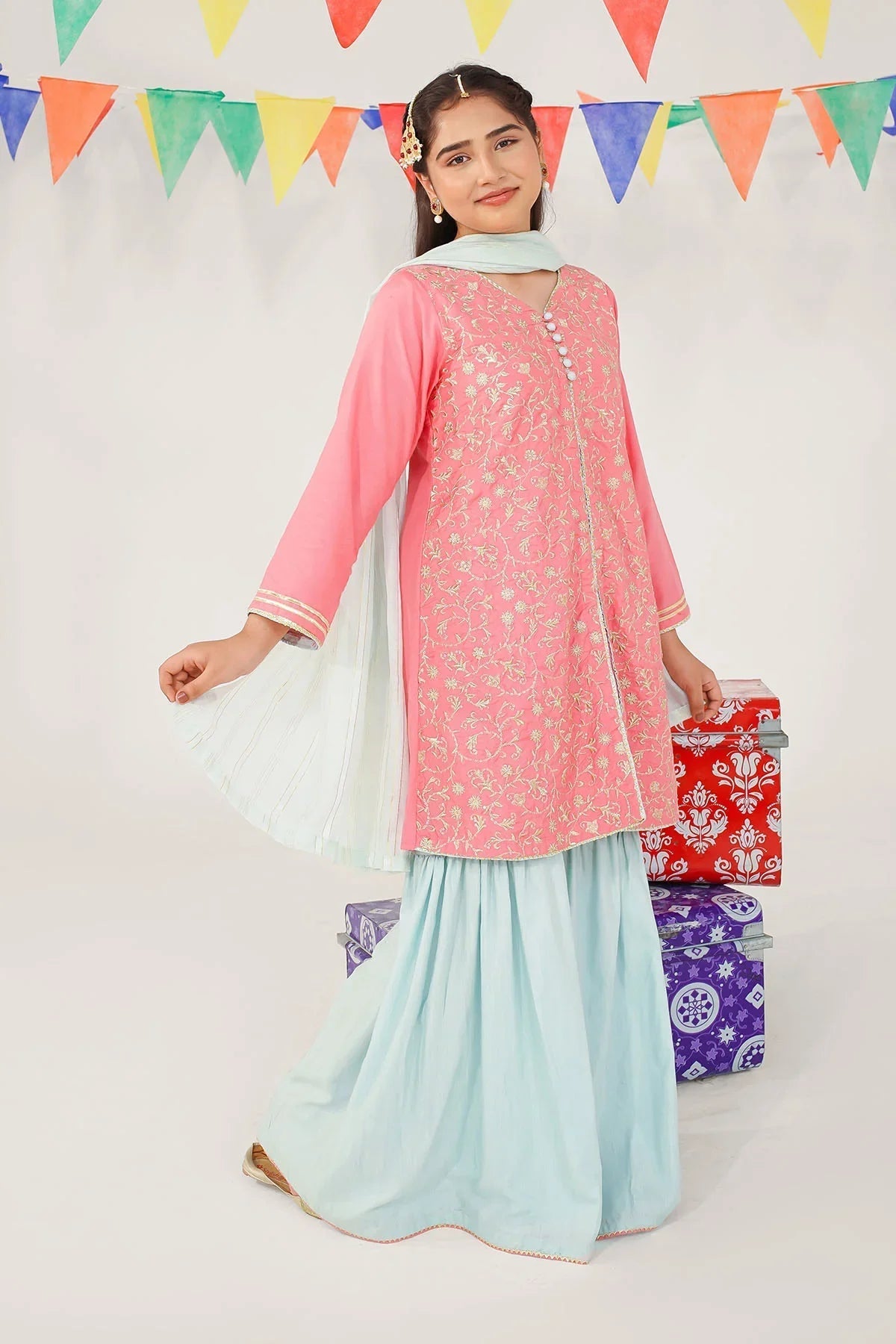 Top: Candy Pink Cotton Silk Kurta With Embroidery Bottom: Tiffany Blue Cotton Silk Gharara Dupatta: Tiffany Blue Khaddi Net Dupatta