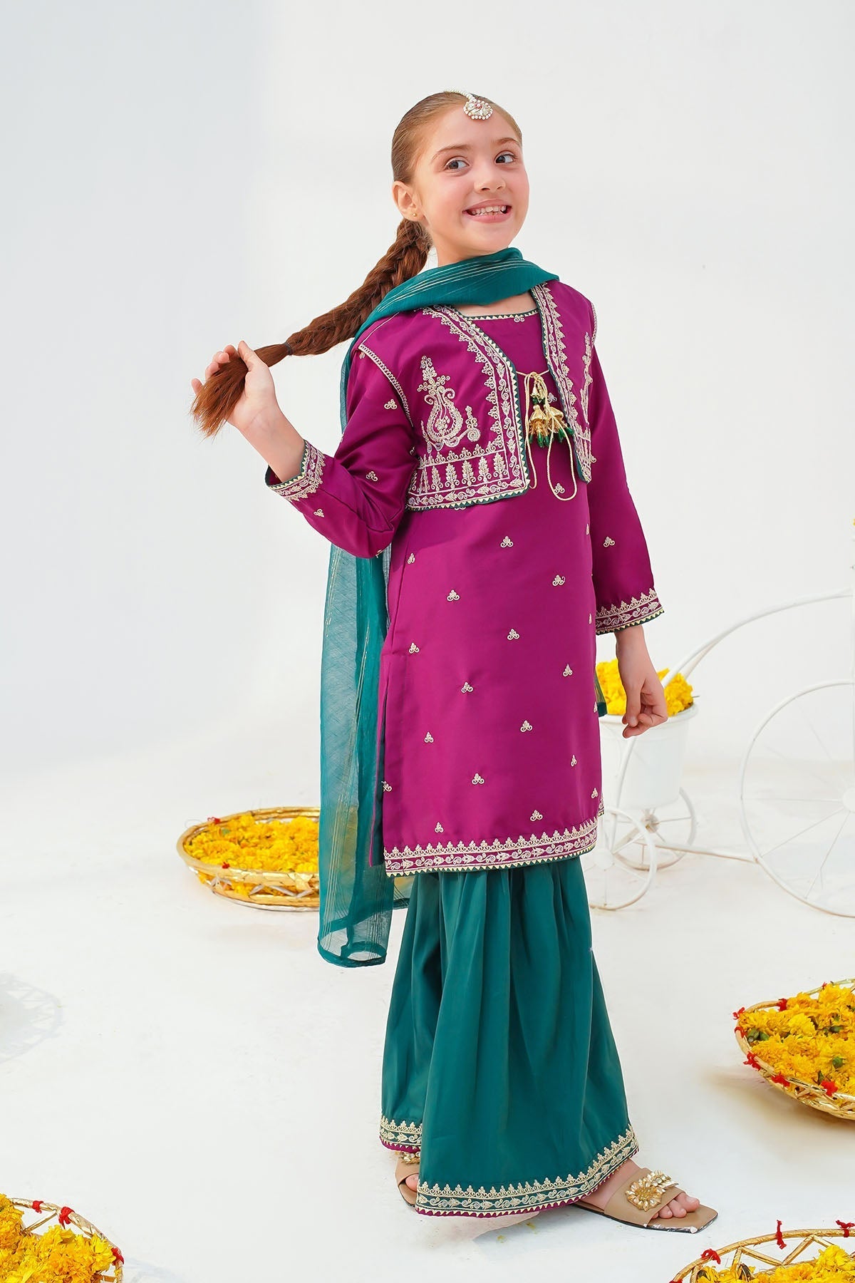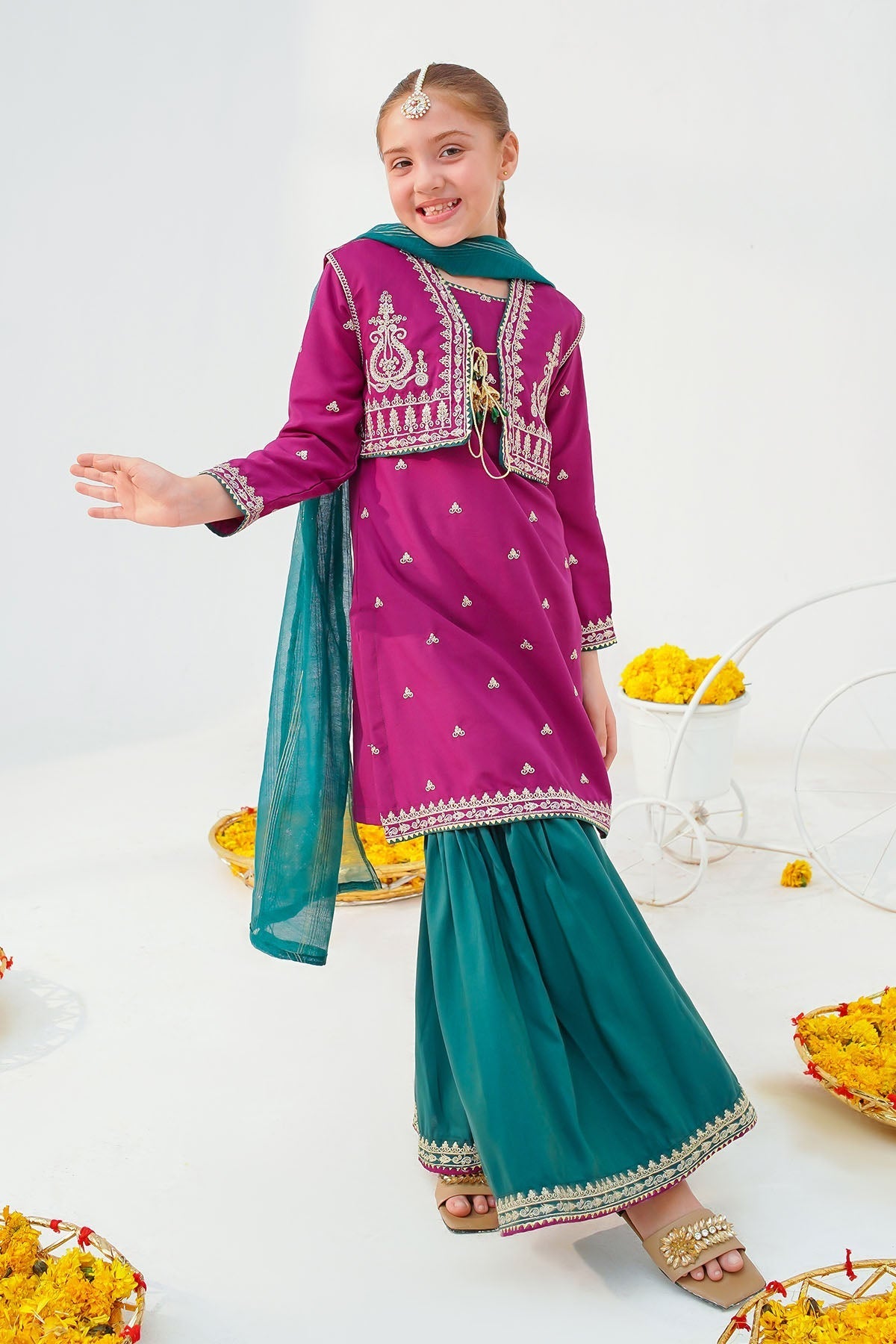 Top: Magenta Pink Raw Silk Kurta & Koti With Embroidery and TasselsBottom: Green Raw Silk Gharara With EmbroideryDupatta: Green Khaddi Net Dupatta