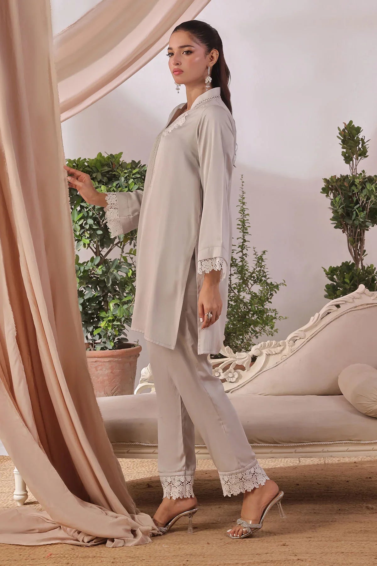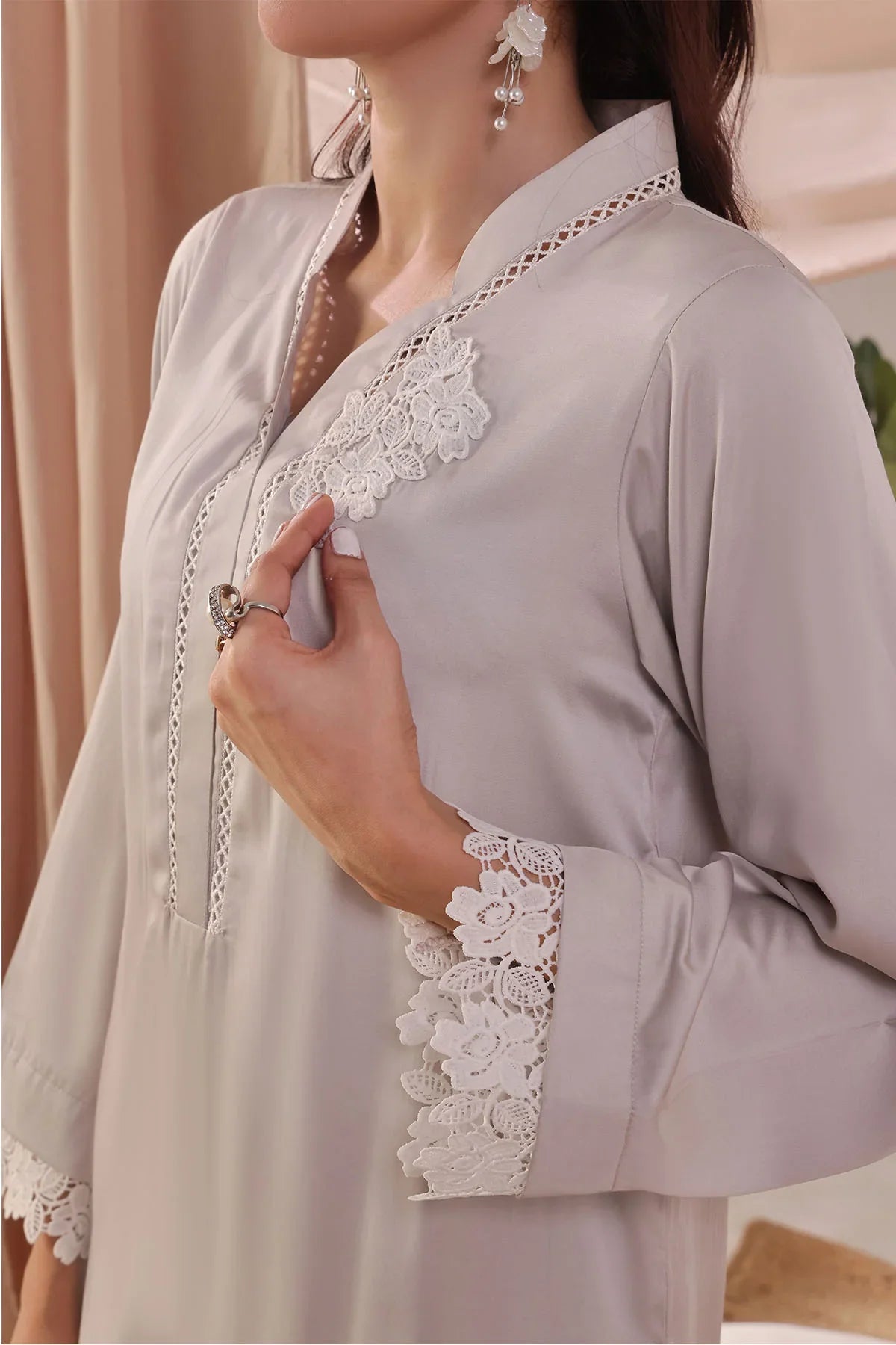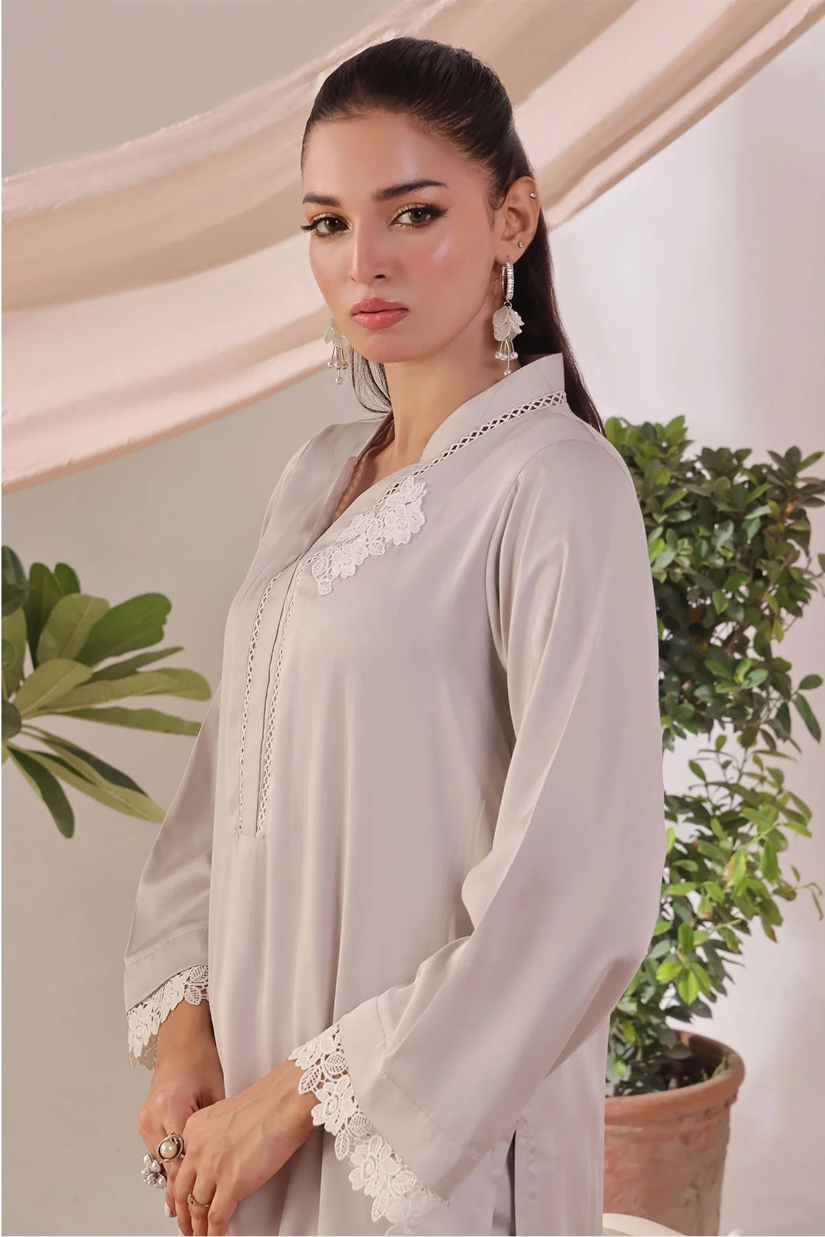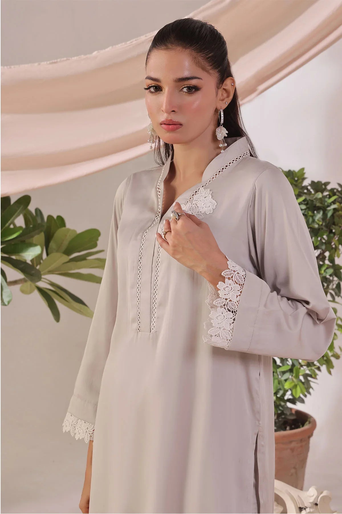 Top: Grey Silk Kurta With Crotia LacesBottom: Grey Silk Trouser
