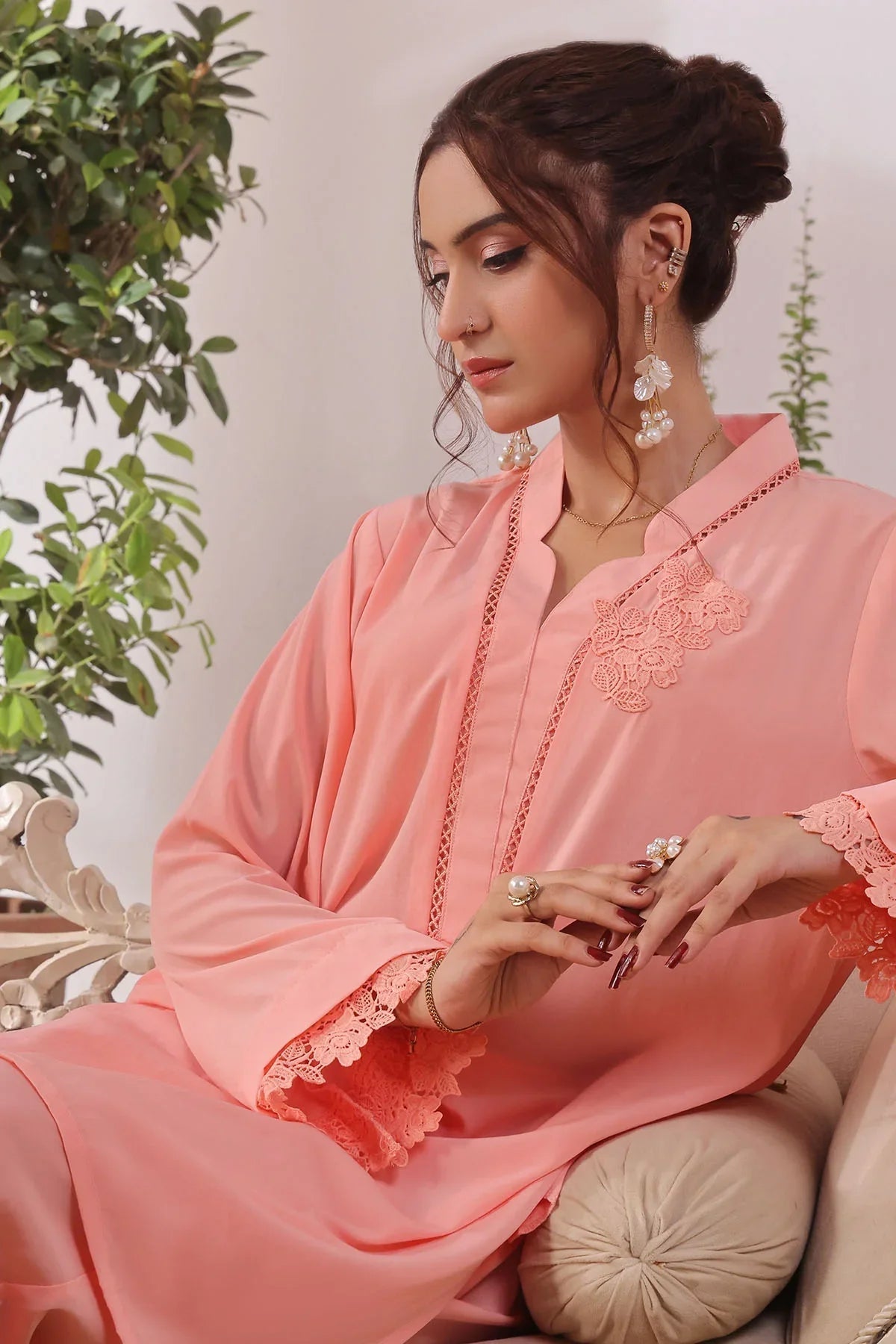 Top: Peach Silk Kurta With Crotia LacesBottom: Peach Silk Trouser