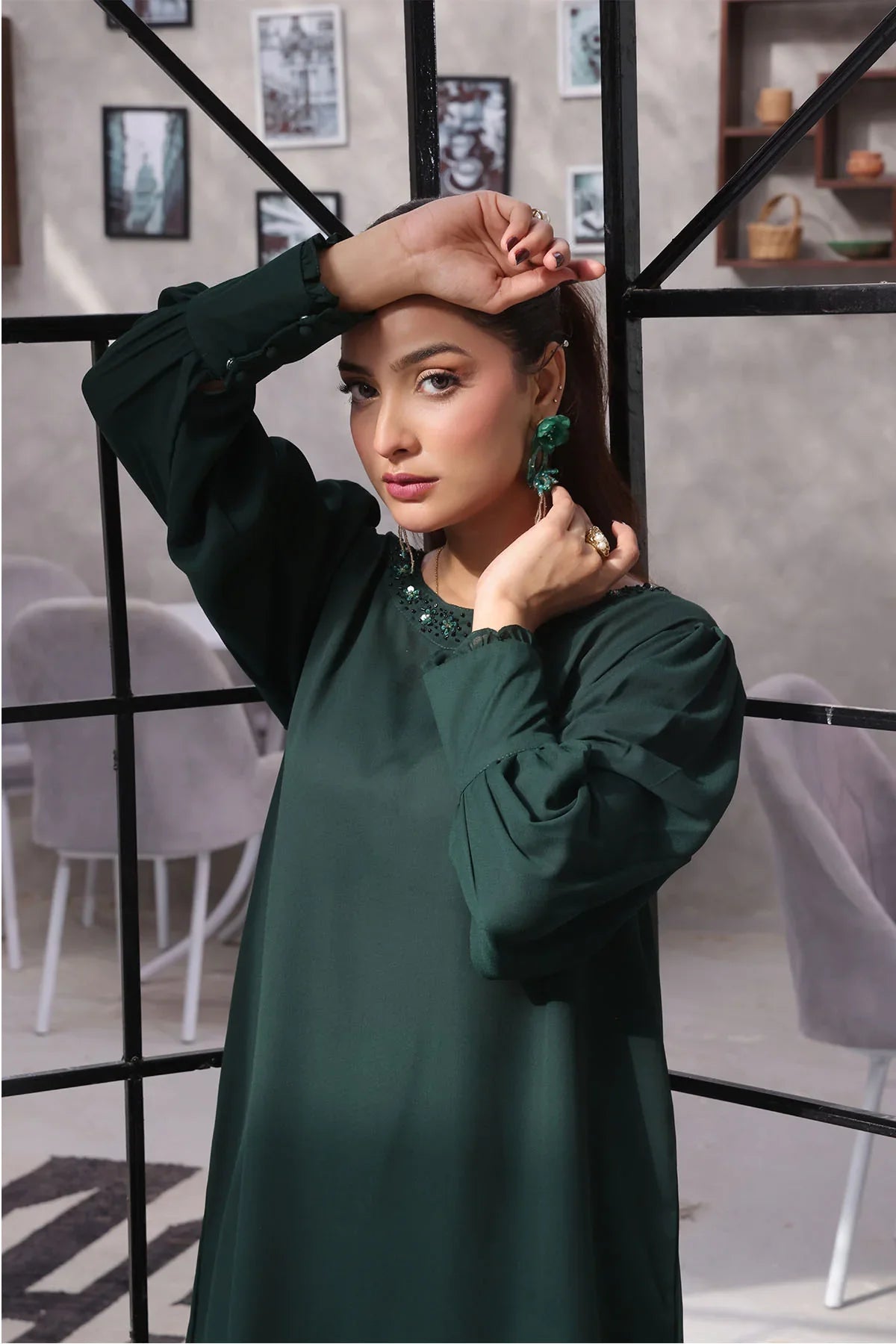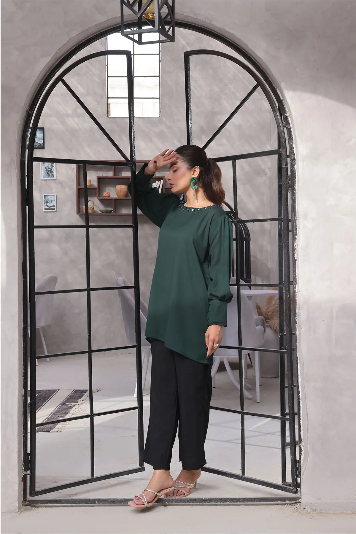 Top: Emerald Green Georgette Top With Hand Adda WorkBottom: Black Georgette Trouser