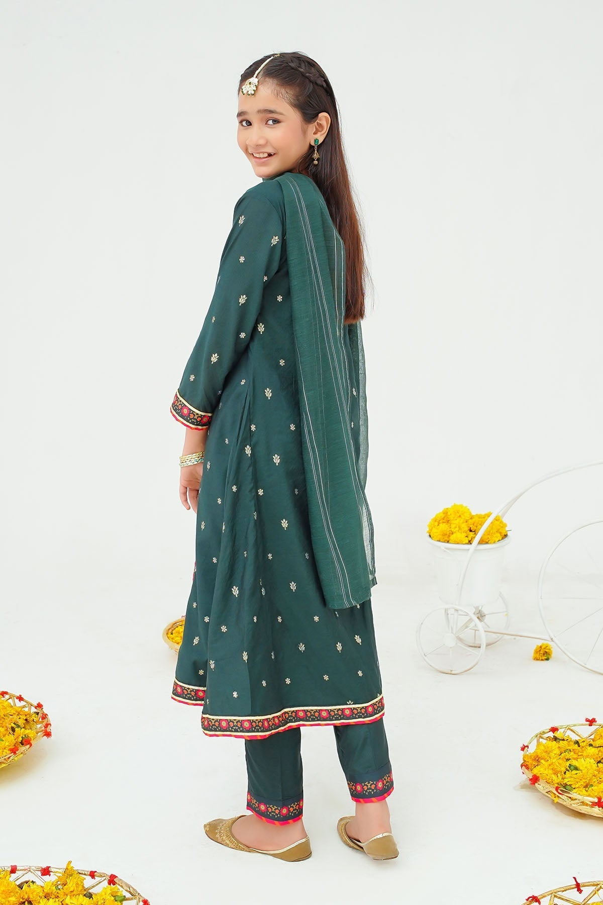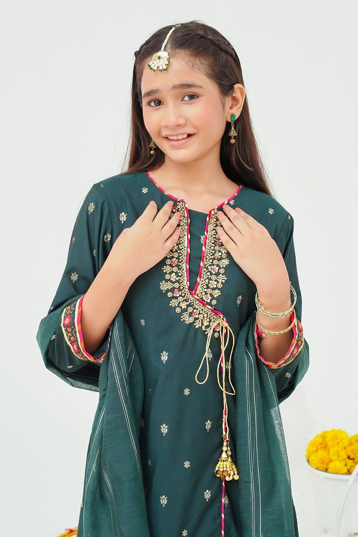 Top: Dark Green Jacquard Maxi With Hand Adda Work, Tassels and Digital PrintÂ