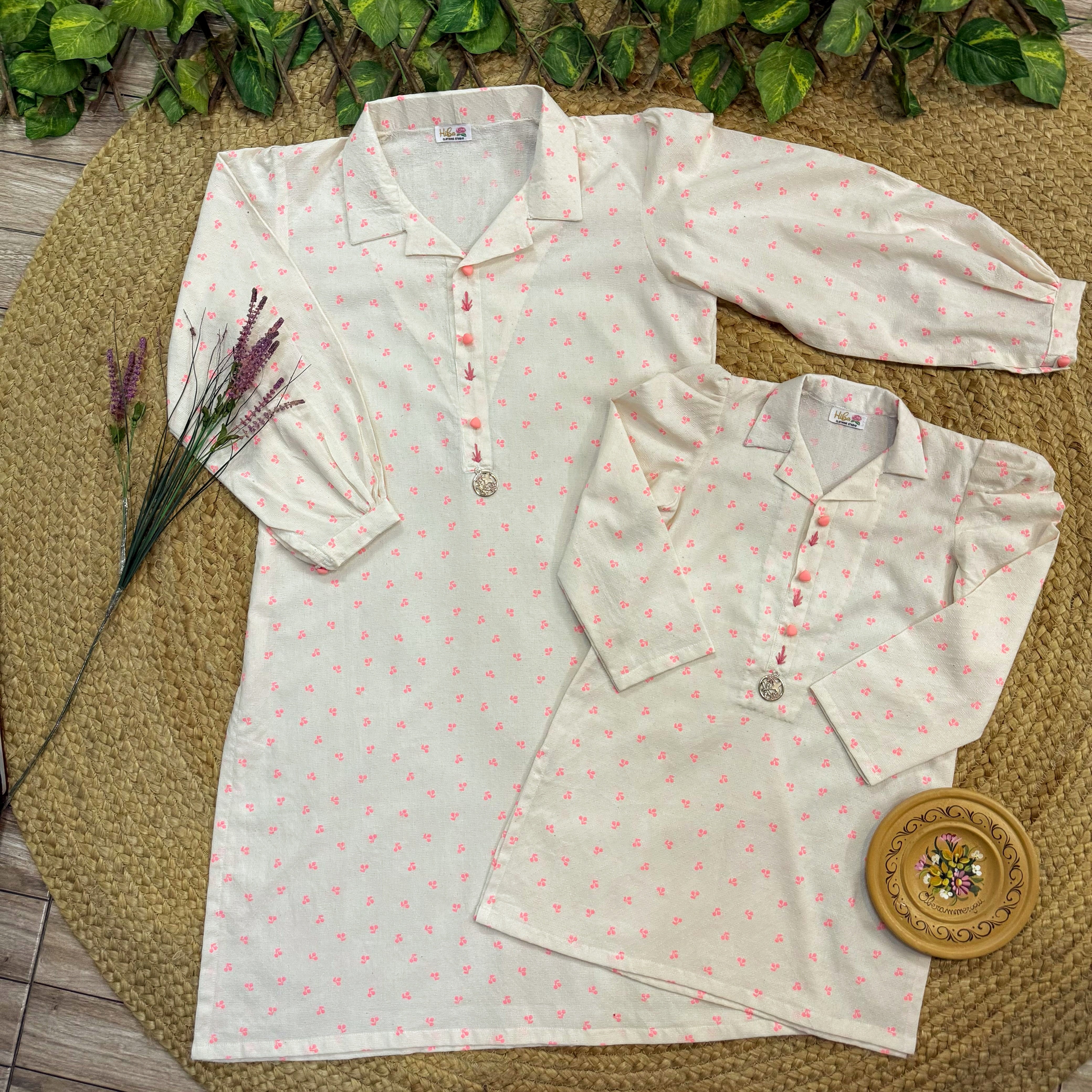 Self-textured Lawn kurta for mommy and daughter styled with coat collar, neckline adorned with buttons and cute metal charm.