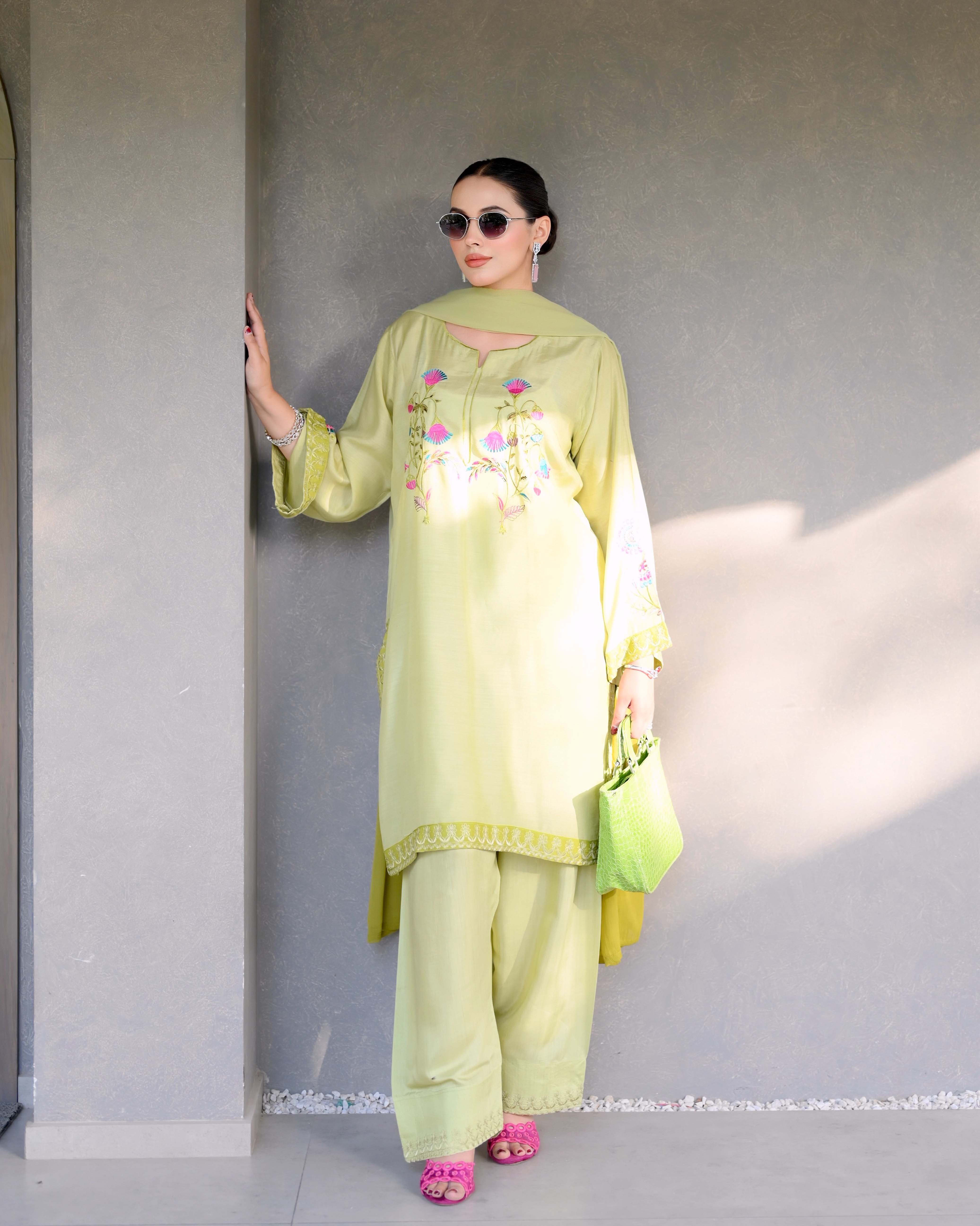 Radiating soft elegance, this 2-piece pistachio green ensemble is crafted from premium viscose lawn and adorned with intricate embroidery.