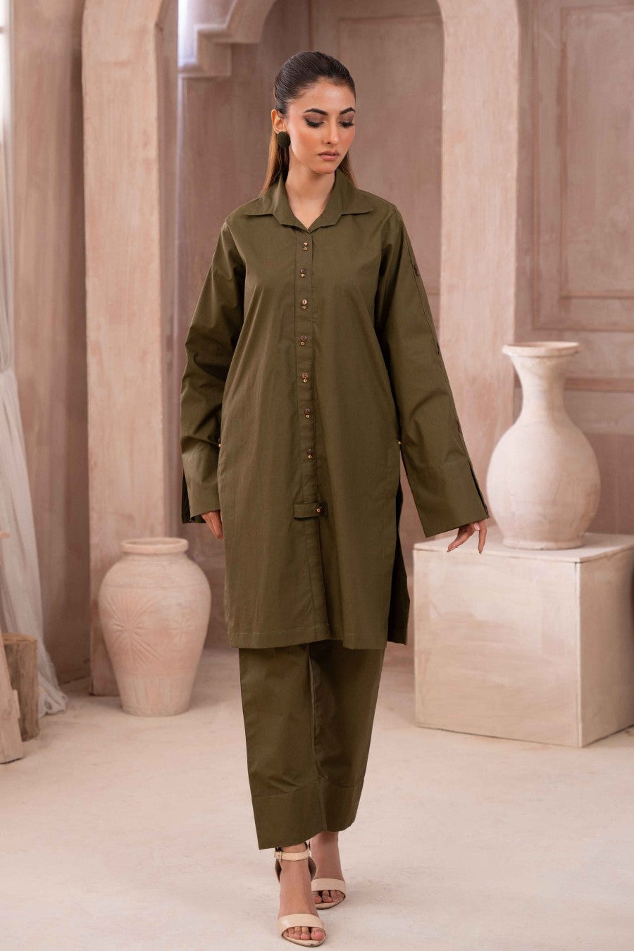 Dyed cotton plain fabric featuring a boxy cut, front open shirt with collar and sleeves. These are embellished with buttons on the front shirt and sleeves. Paired with a matching trouser, Olive aesthetically rich outfit is a great option.